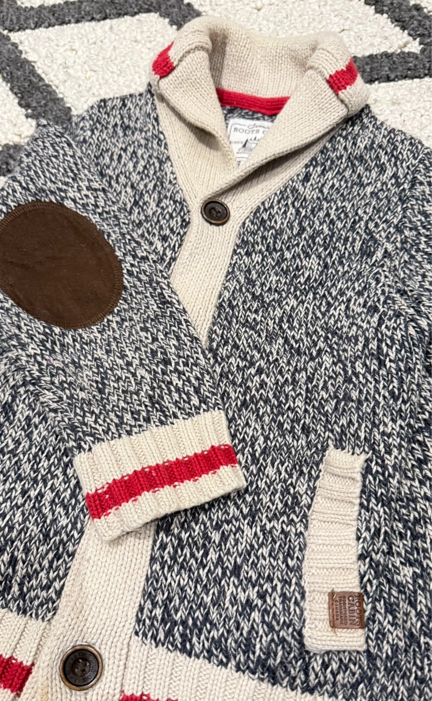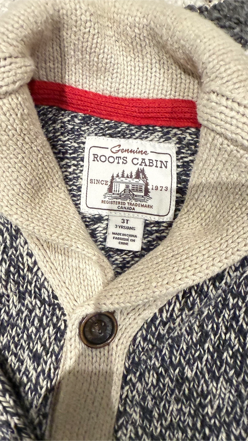 A cute Roots Cabin cardigan in size 3T! It features a classic design with elbow patches and a cozy knit. Perfect for keeping your little one warm and stylish this fall