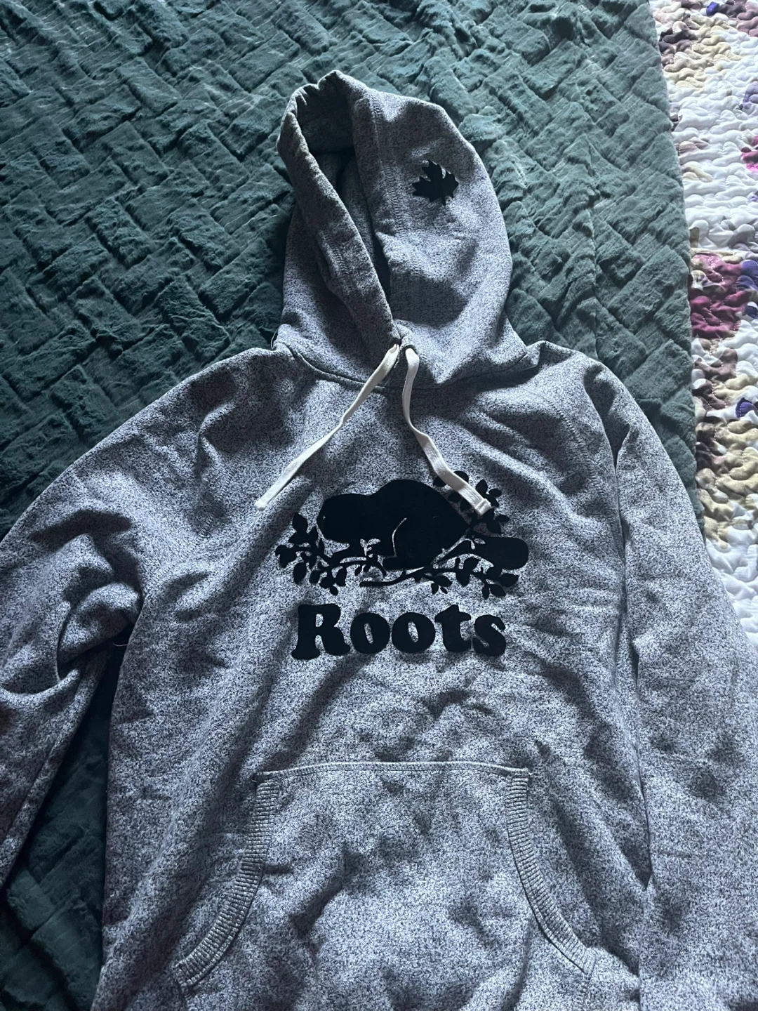 10Cozy Roots hoodie in a grey colour. Features the classic Roots beaver logo on the front. Perfect for staying warm on chilly days!