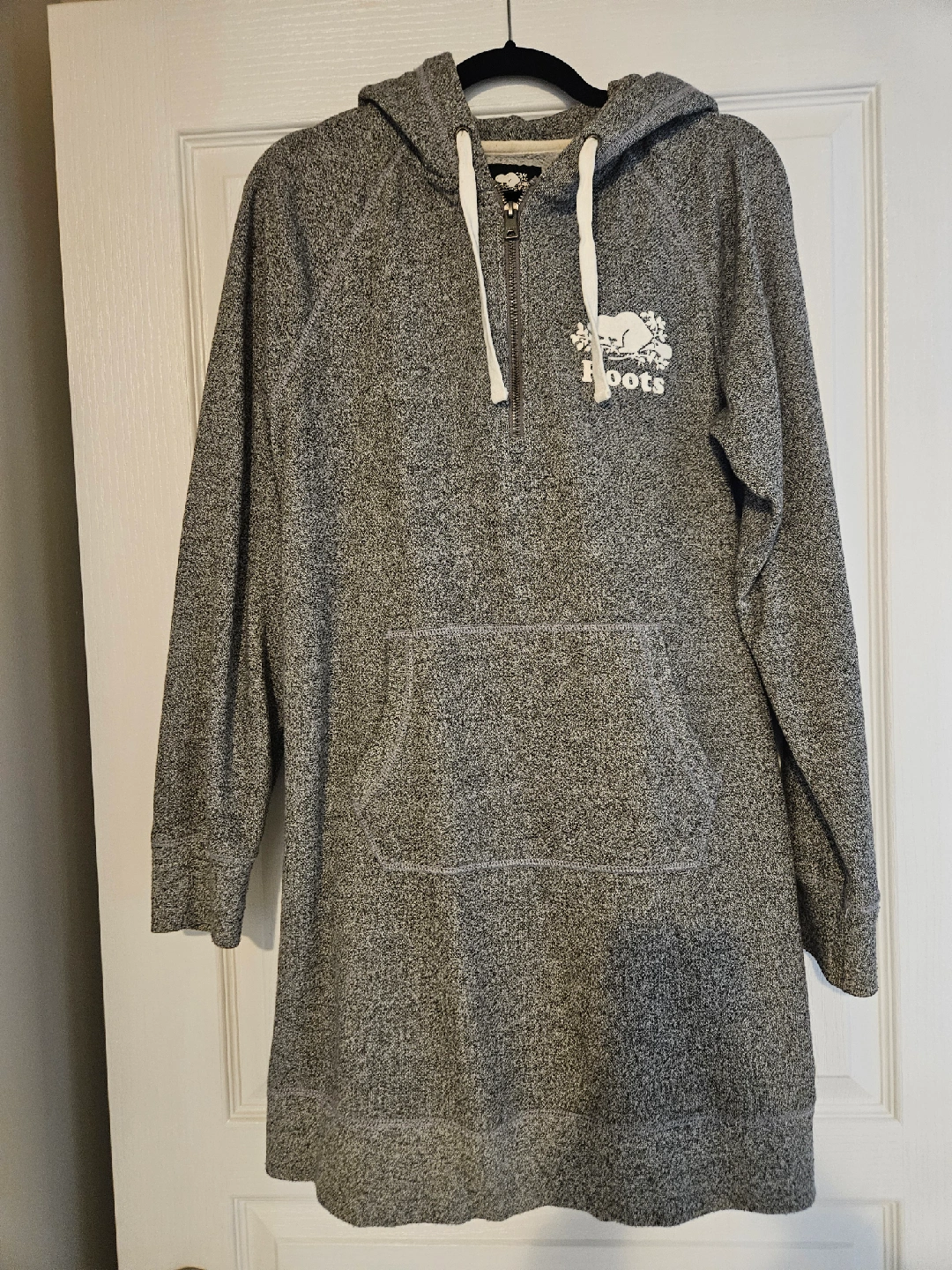 Cozy Roots hoodie dress in a heather grey colour! It's a size medium and made of 55% cotton and 45% polyester. Perfect for those comfy days