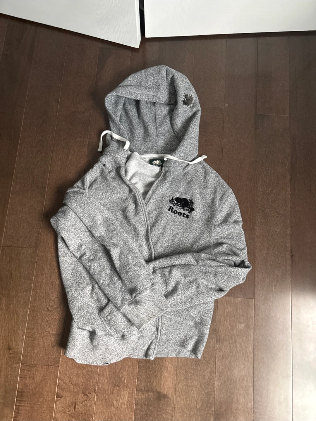 42Selling a gently used Roots zip-up hoodie in a lovely grey colour. It's in great condition.