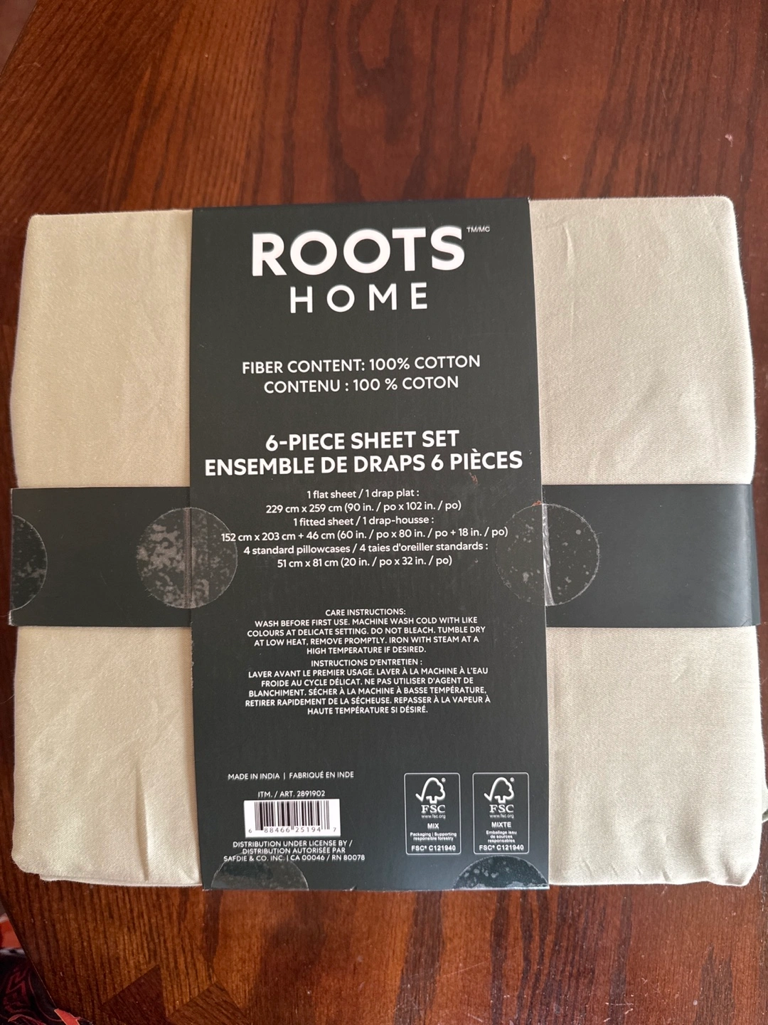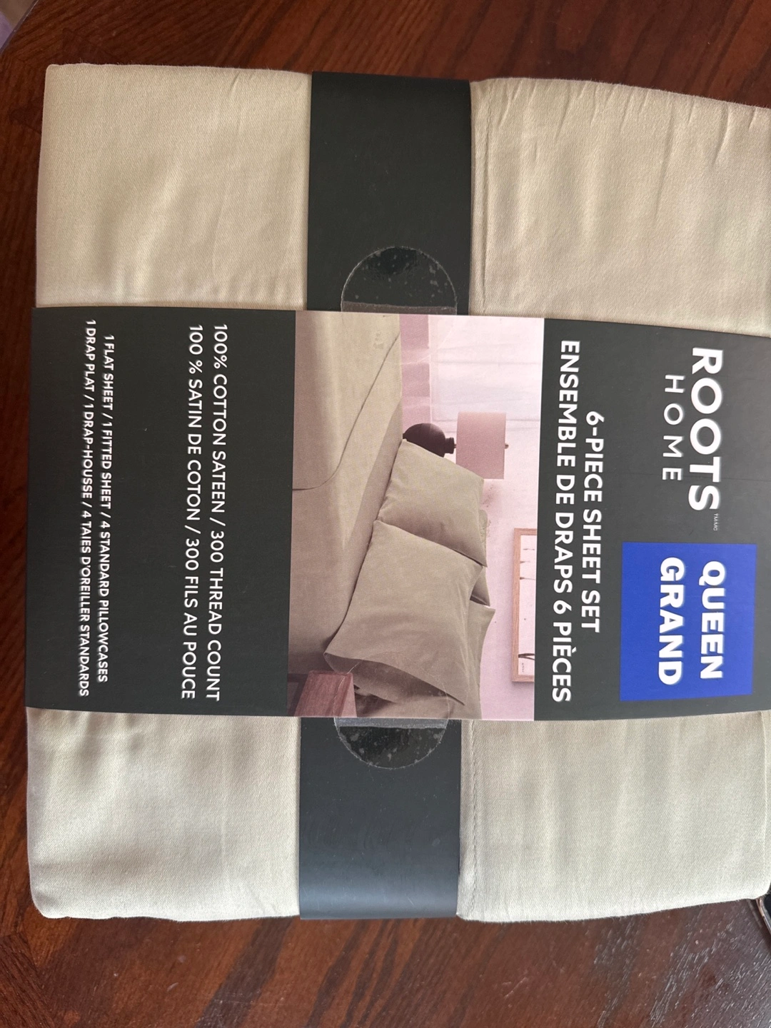 72Brand new Roots Home queen size 6-piece sheet set! The set is made from 100% cotton sateen with a 300 thread count. Includes 1 flat sheet, 1 fitted sheet, and 4 standard pillowcases. Super soft and comfy!