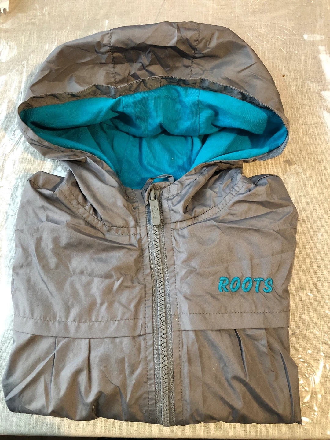 10Roots Kids jacket in size small (5-6 years). This jacket features a grey exterior and a bright blue interior. Perfect for layering!