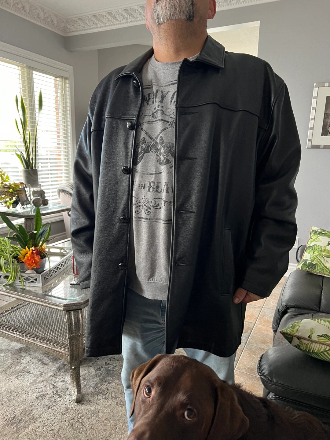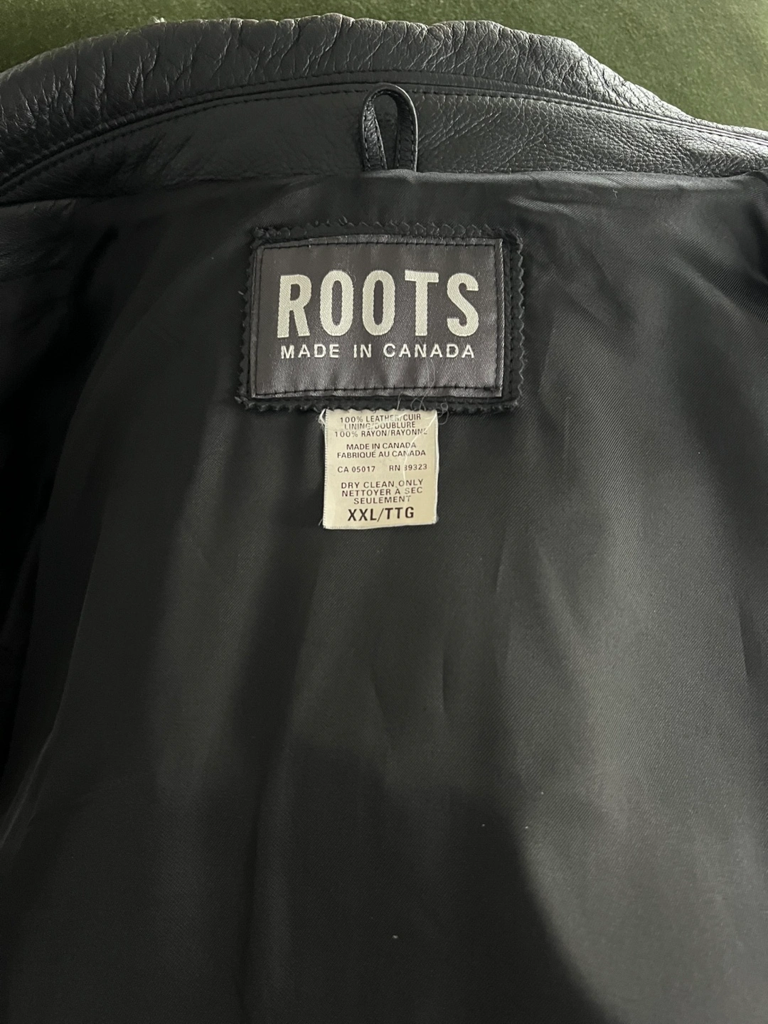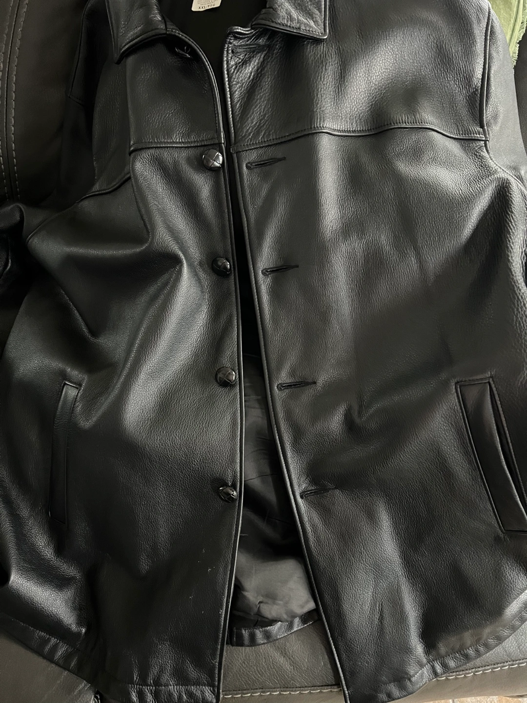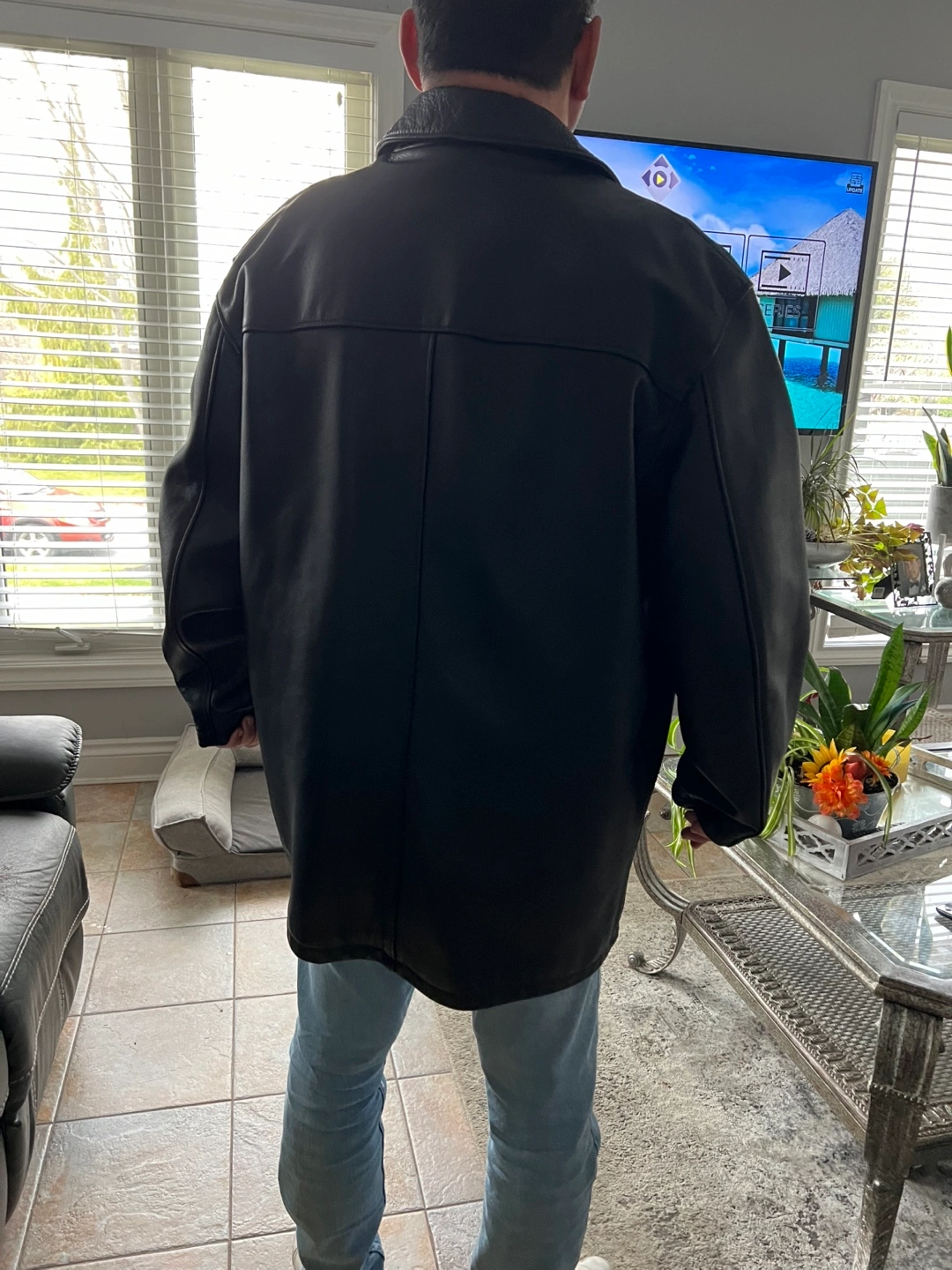 10Black leather jacket with button closure. Has a small pocket on the left side and two larger pockets on the bottom. The jacket is in good condition and was made in Canada.