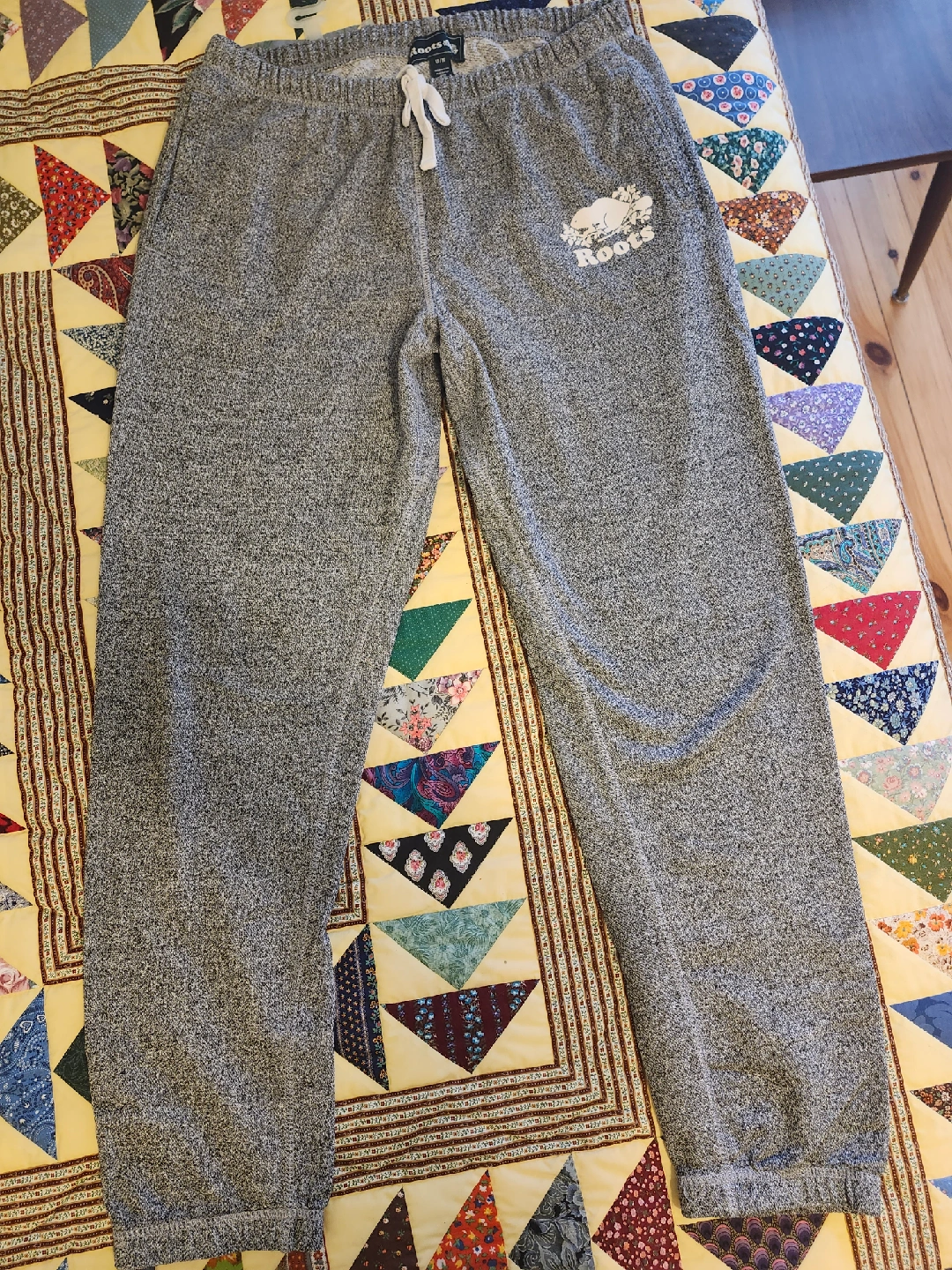 10Cozy Roots sweatpants in a salt & pepper colour. They're a size medium and feature the classic Roots logo. Perfect for lounging around the house or running errands.