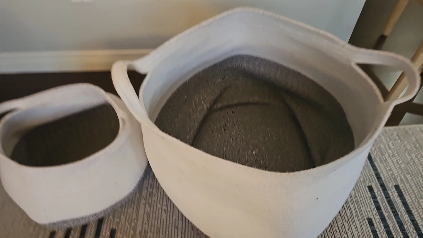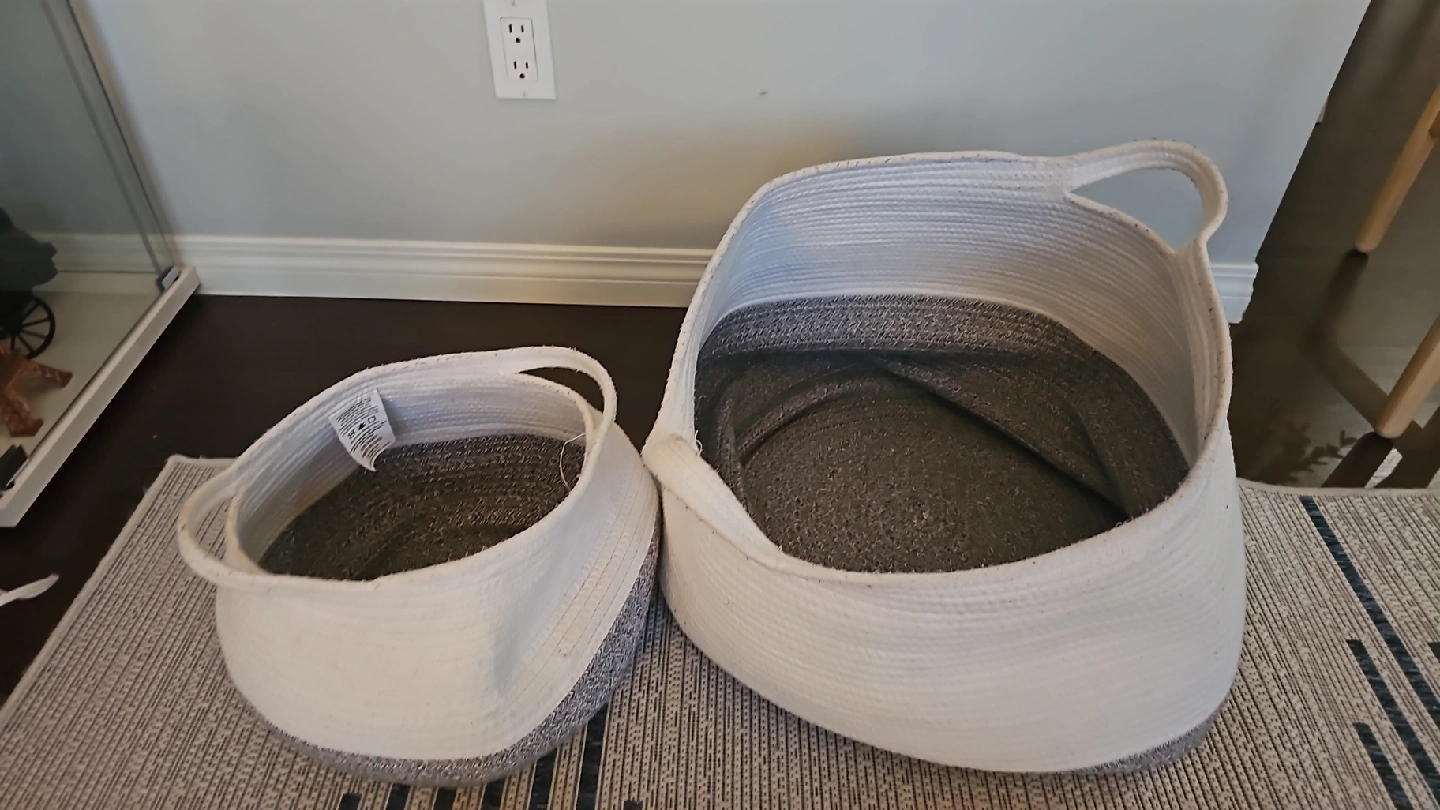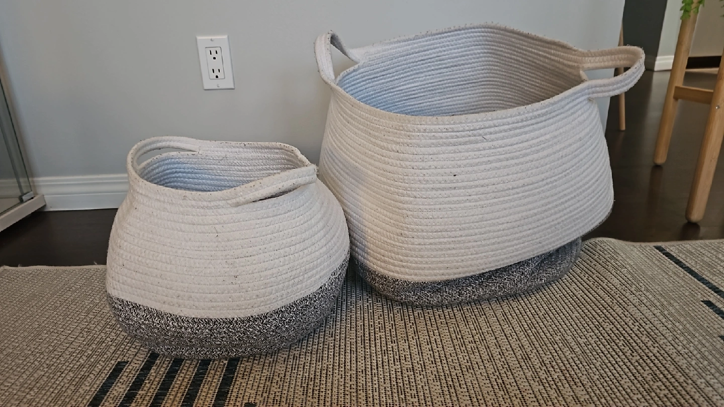 Selling a set of two rope baskets. They're in great shape and perfect for organizing things around the house! The baskets are white with a grey bottom.