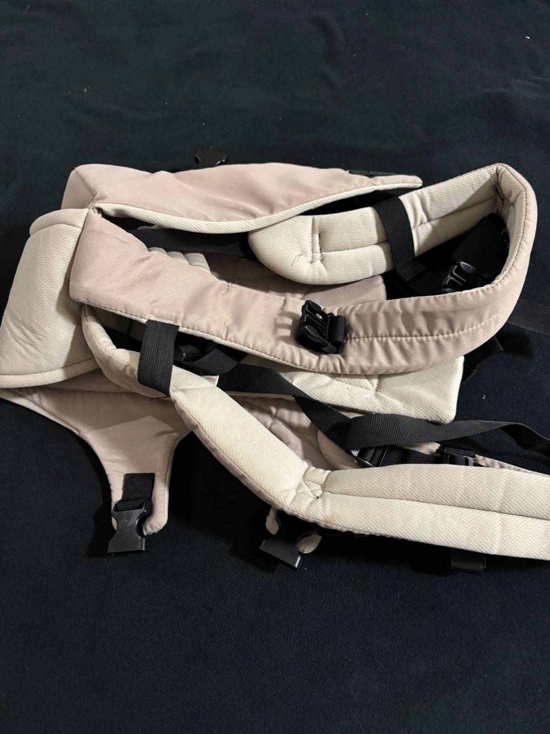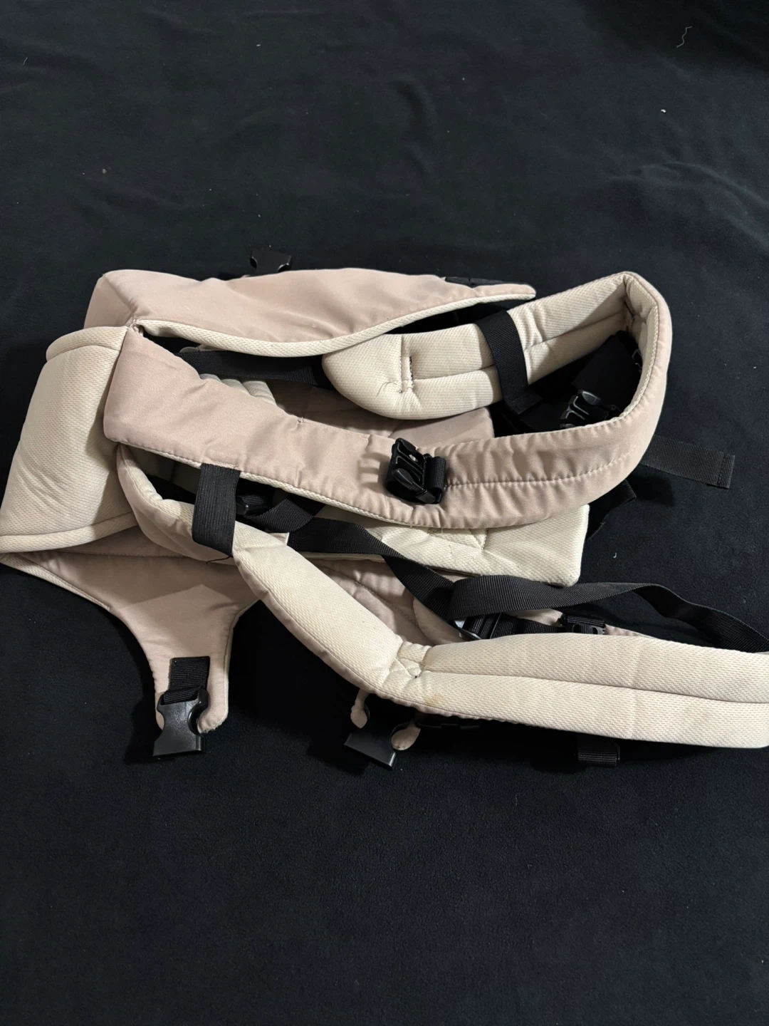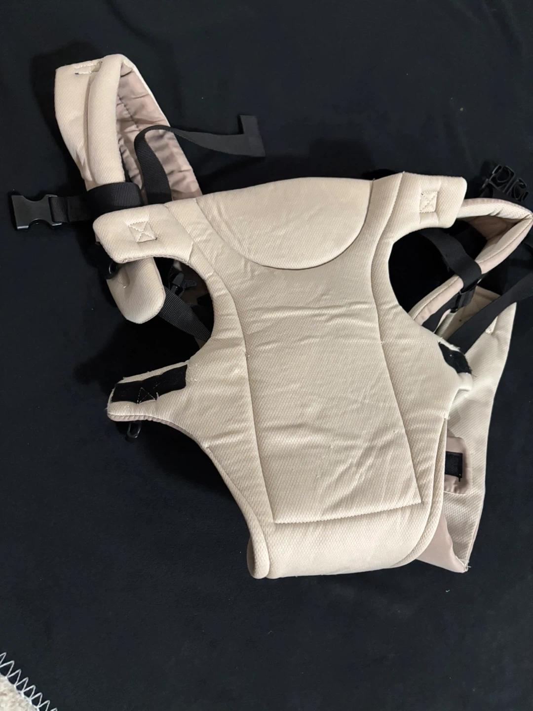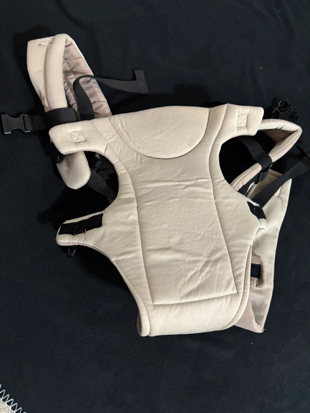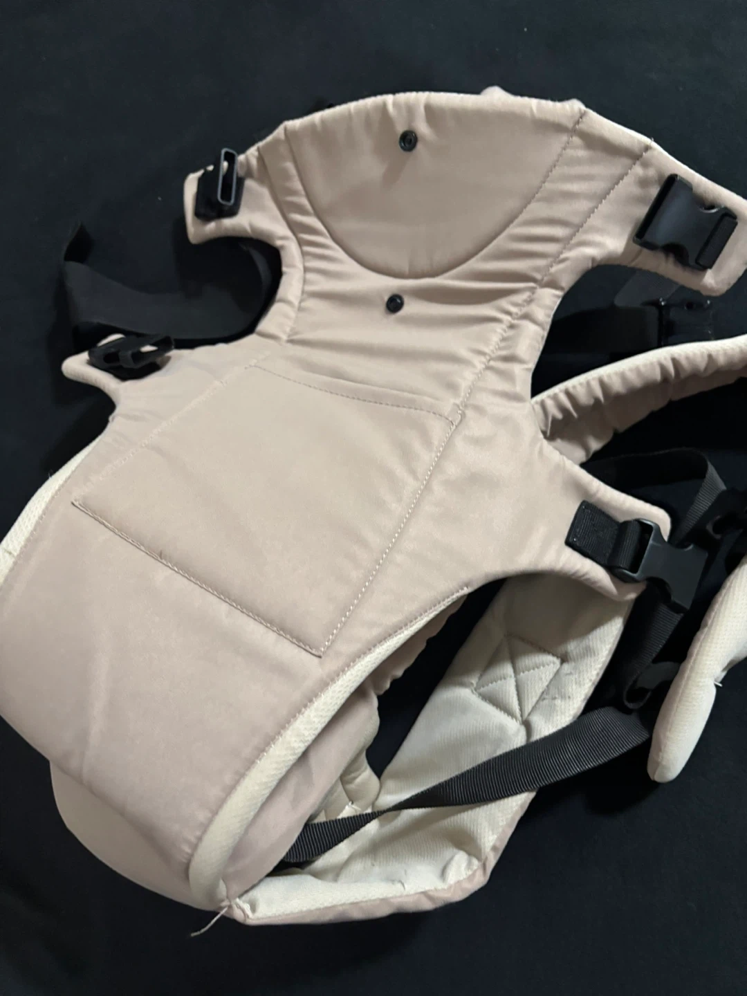 This is a tan baby carrier. It features adjustable straps for a comfortable fit. It's designed for carrying infants and toddlers.