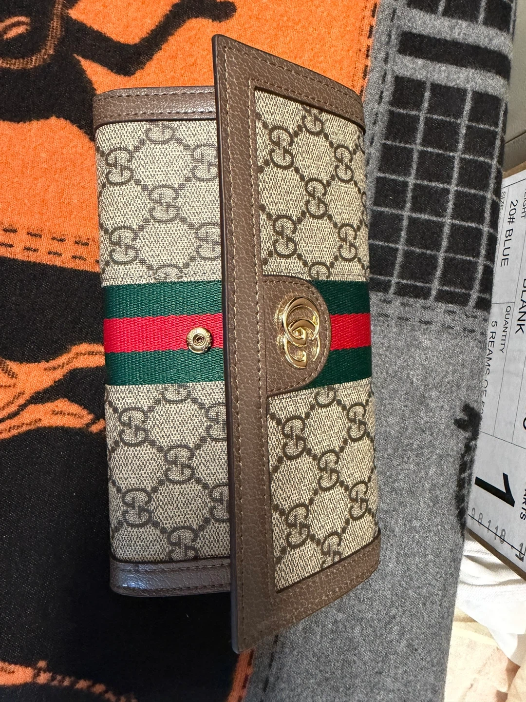 Gucci GG Supreme canvas wallet with brown leather trim. Features the signature green and red stripe detail and gold-tone hardware. Interior includes card slots and a bill compartment. It's a stylish accessory for everyday use!