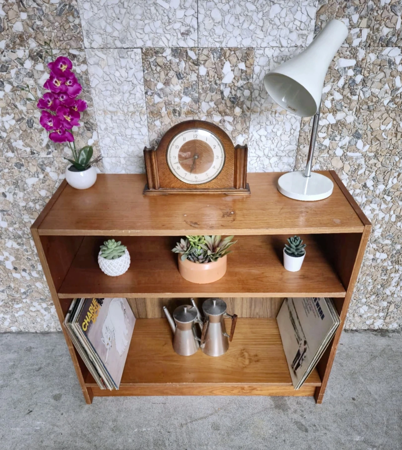 Selling a MCM teak veener shelving unit. It's perfect for displaying books, plants, or other decorative items.