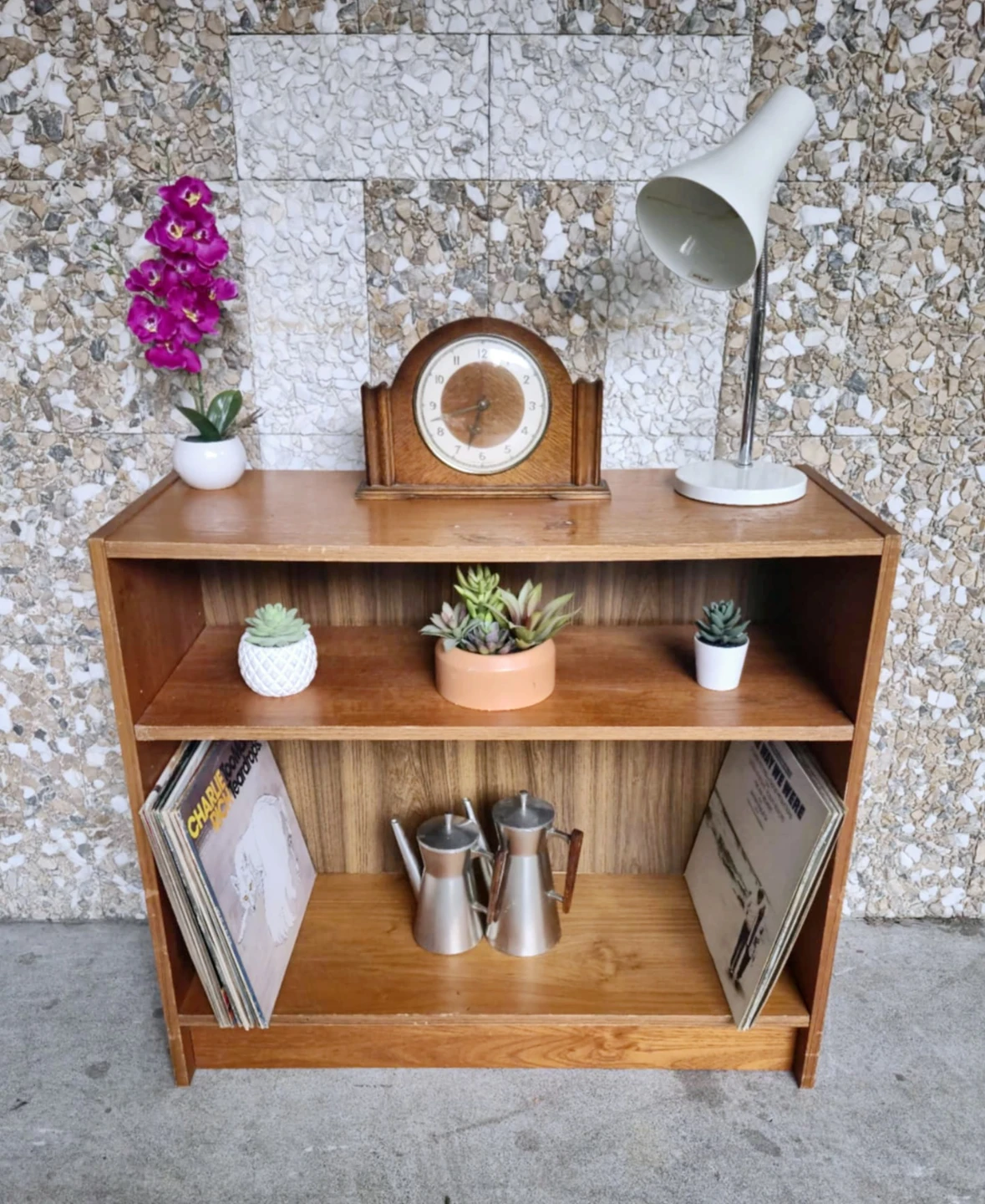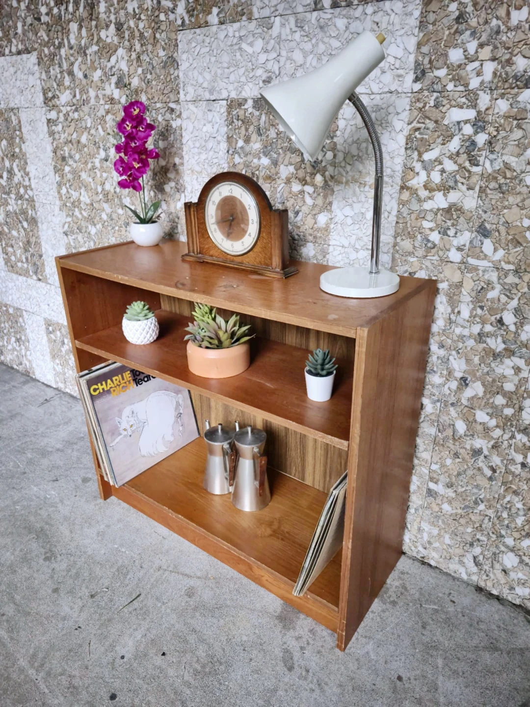 Selling a MCM teak veener shelving unit. It's perfect for displaying books, plants, or other decorative items.