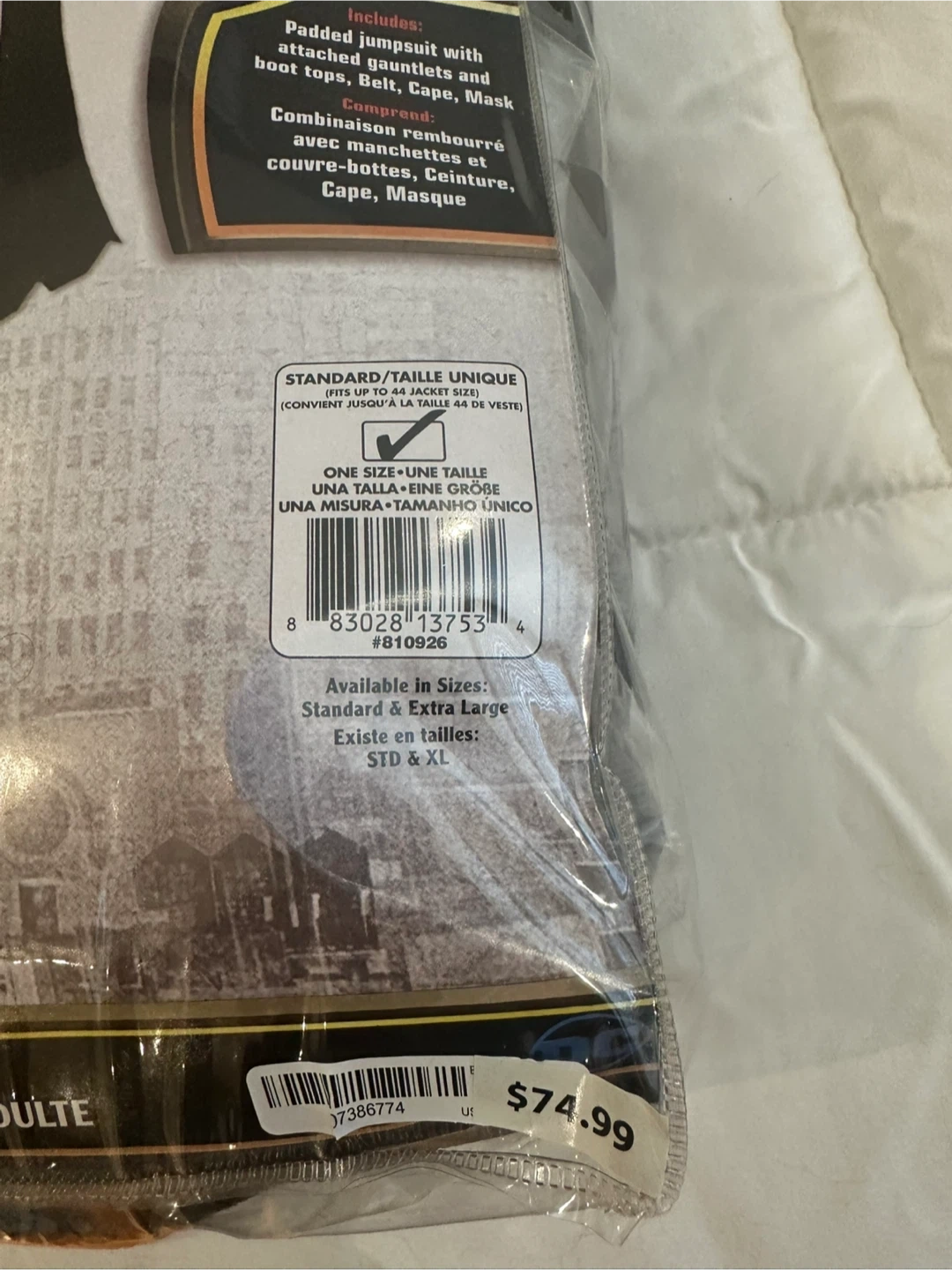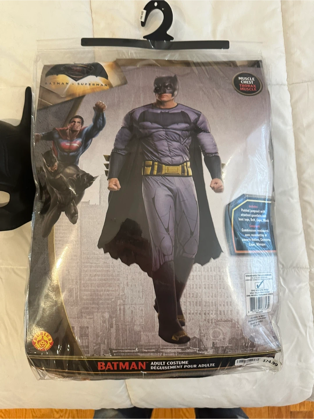Selling a Batman adult costume. It's a standard size. The costume includes a padded jumpsuit with attached gauntlets and boot tops, a belt, cape, and mask. Originally bought for $74.99!