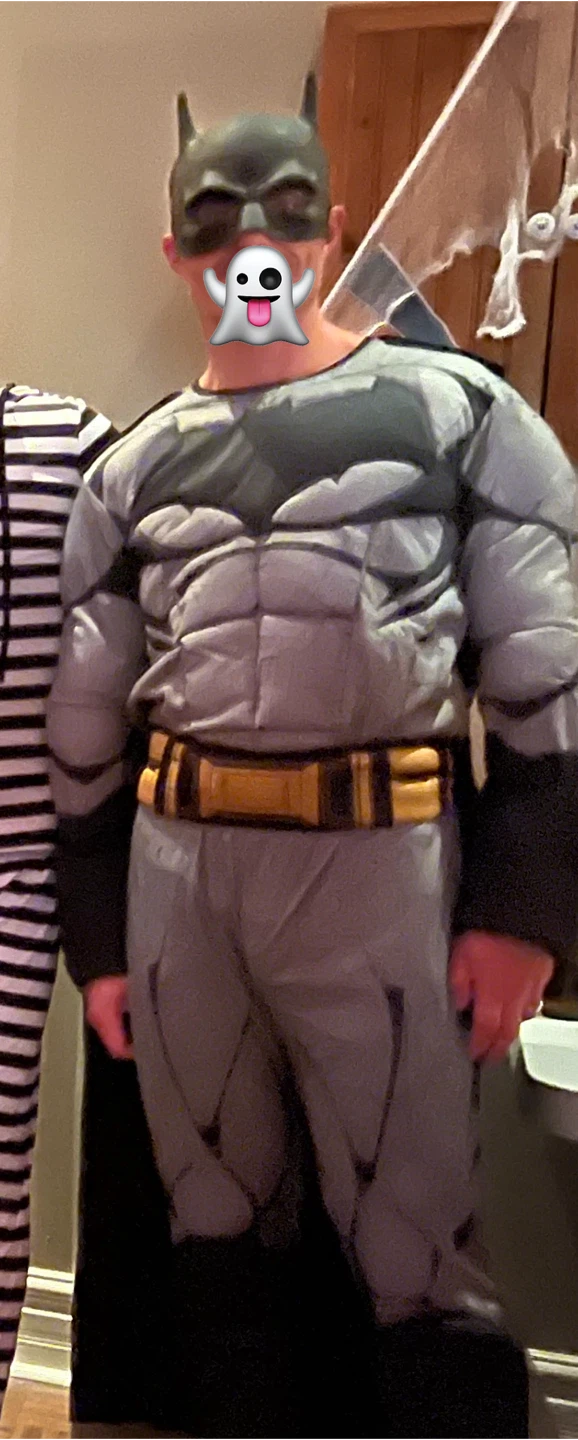 Selling a Batman adult costume. It's a standard size. The costume includes a padded jumpsuit with attached gauntlets and boot tops, a belt, cape, and mask. Originally bought for $74.99!