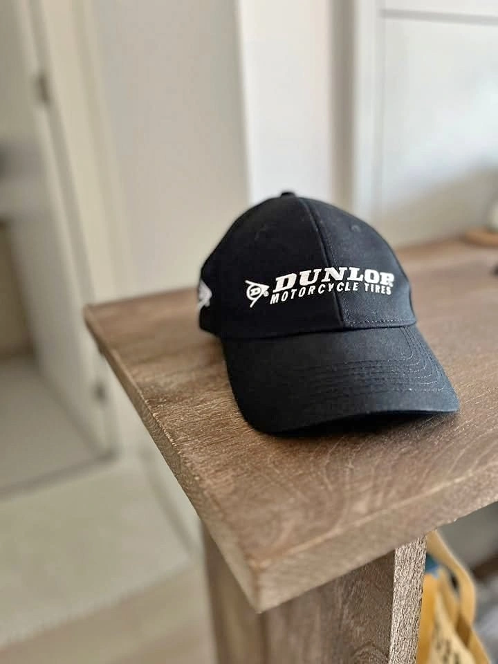 Never worn Dunlop Motorcycle Tires hat in black. Adjustable strap for a comfortable fit. Embroidered Dunlop logo on front and side and back. Perfect for motorcycle enthusiasts or collectors.
