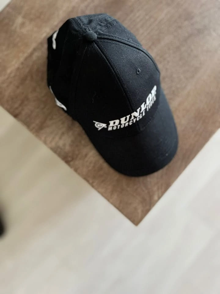 Never worn Dunlop Motorcycle Tires hat in black. Adjustable strap for a comfortable fit. Embroidered Dunlop logo on front and side and back. Perfect for motorcycle enthusiasts or collectors.
