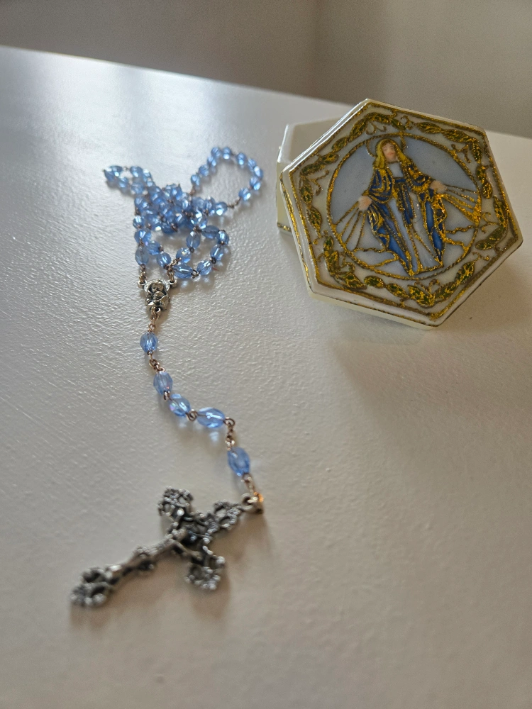 Beautiful light blue rosary beads. Silver-toned crucifix. Keepsake box features Our Lady of Lourdes. Perfect gift or addition to a collection.