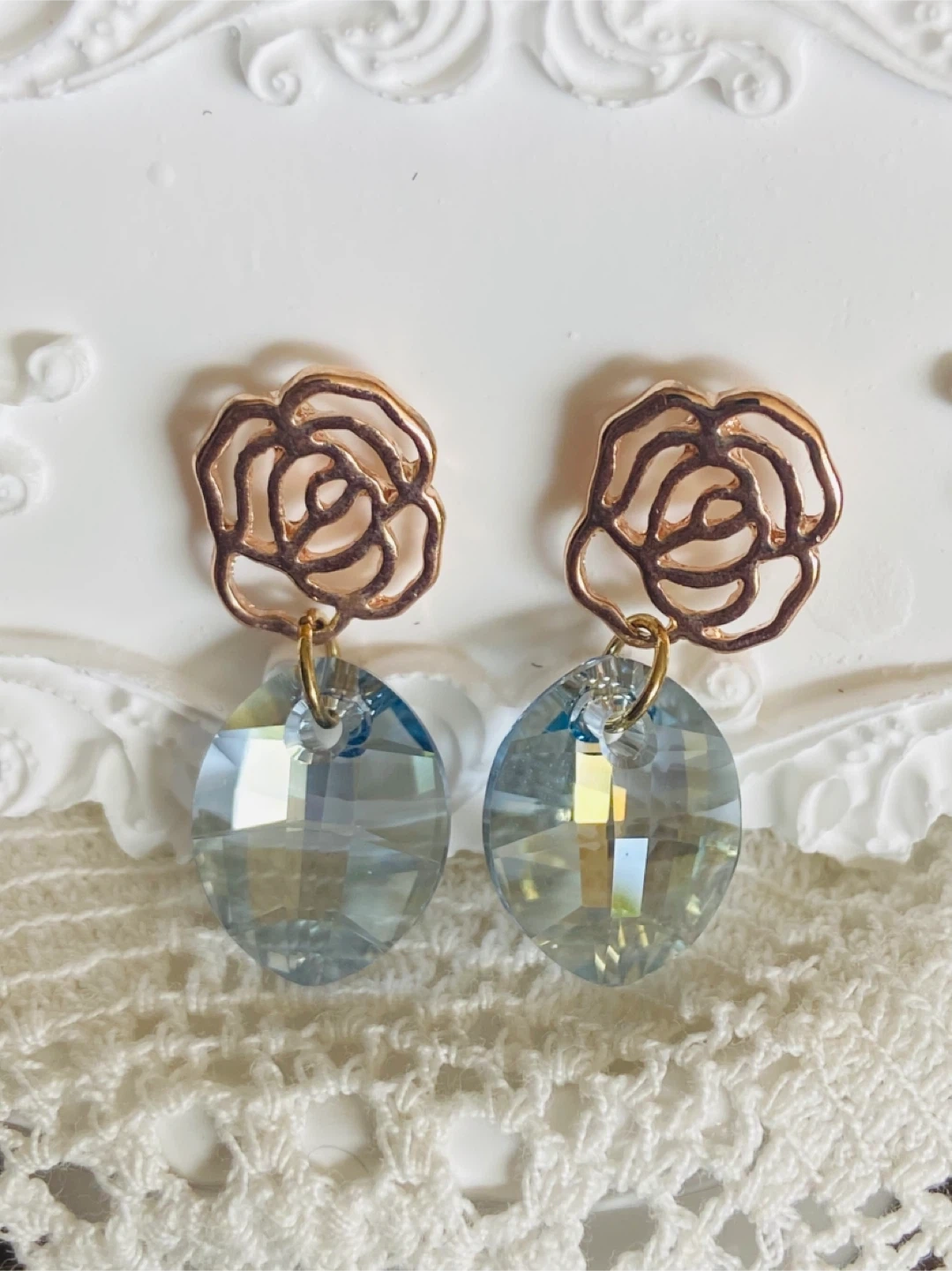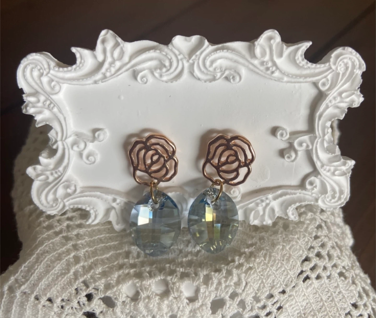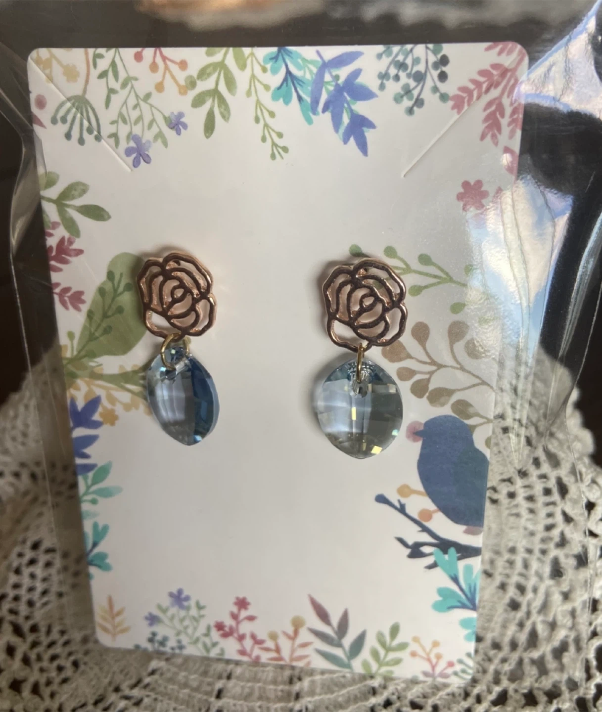 10These are a pair of beautiful drop earrings featuring a rose design with a blue crystal drop. They're in great condition and ready to add a touch of elegance to any outfit!