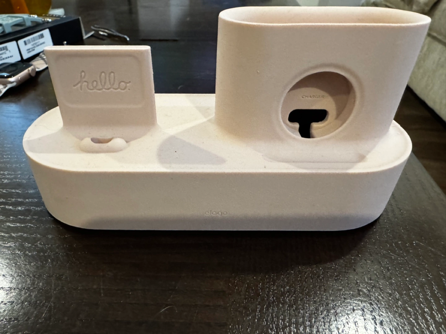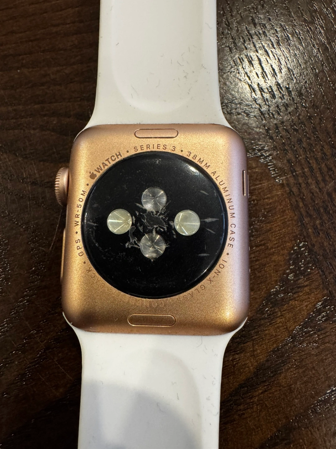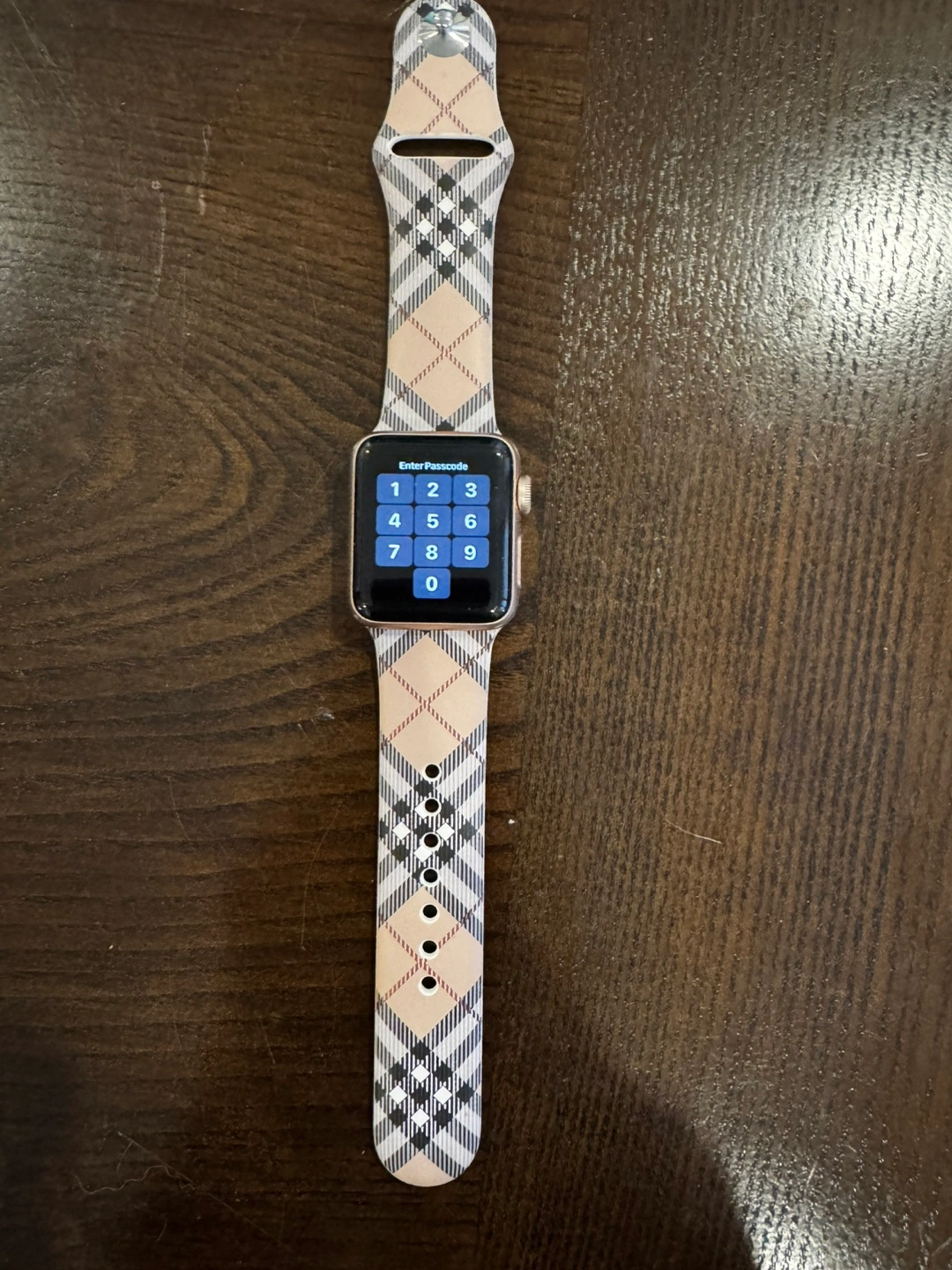 Apple Watch Series 3, 38mm aluminum case. Includes three bands: one patterned silicone band, one leopard print silicone band, and one light blue Coach band. Also included is a pink Elago charging stand.