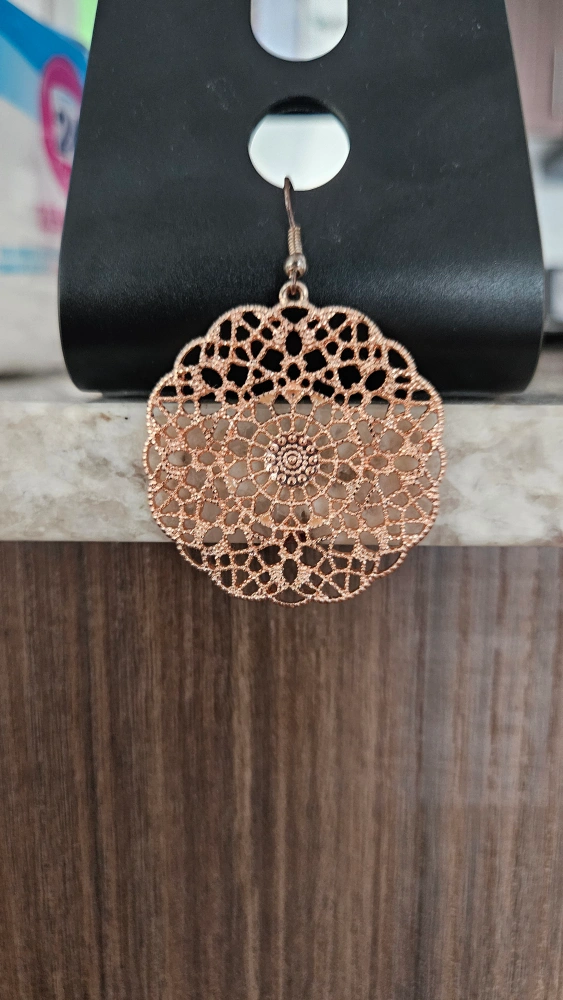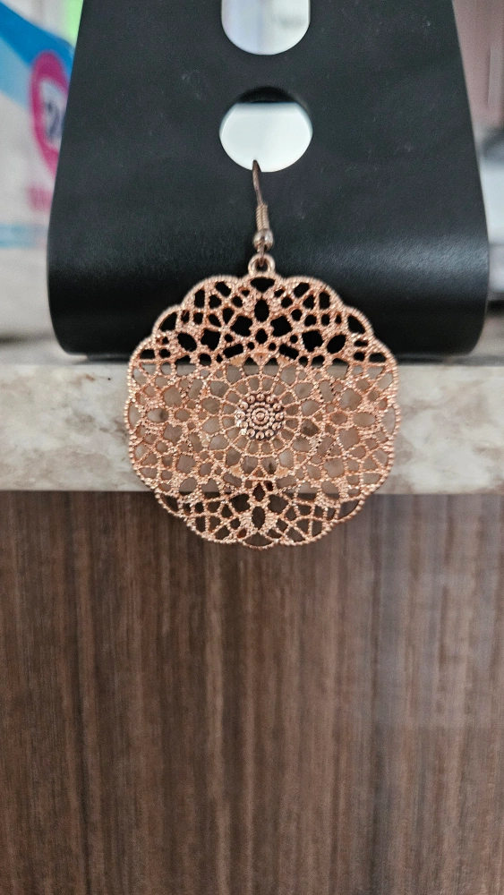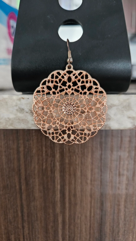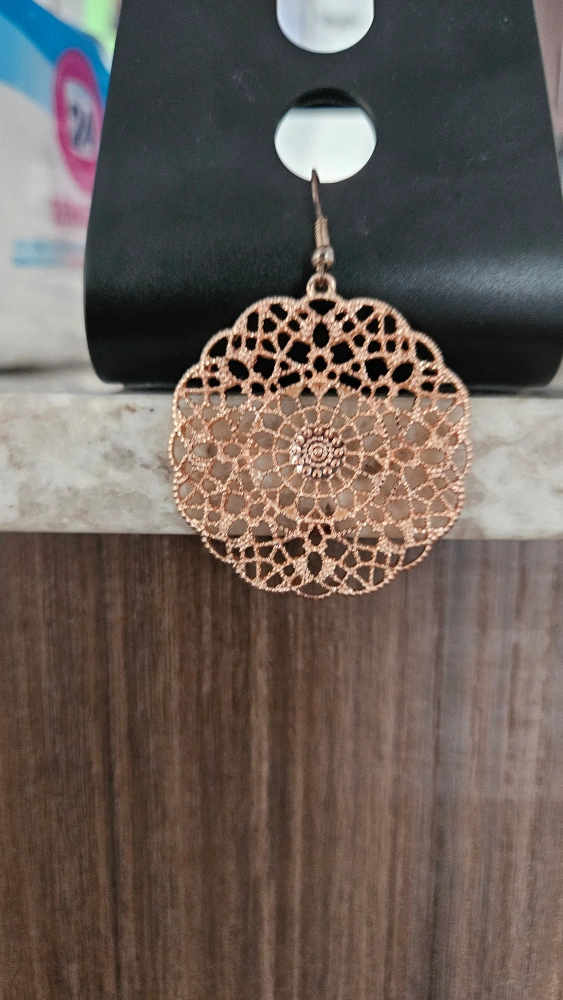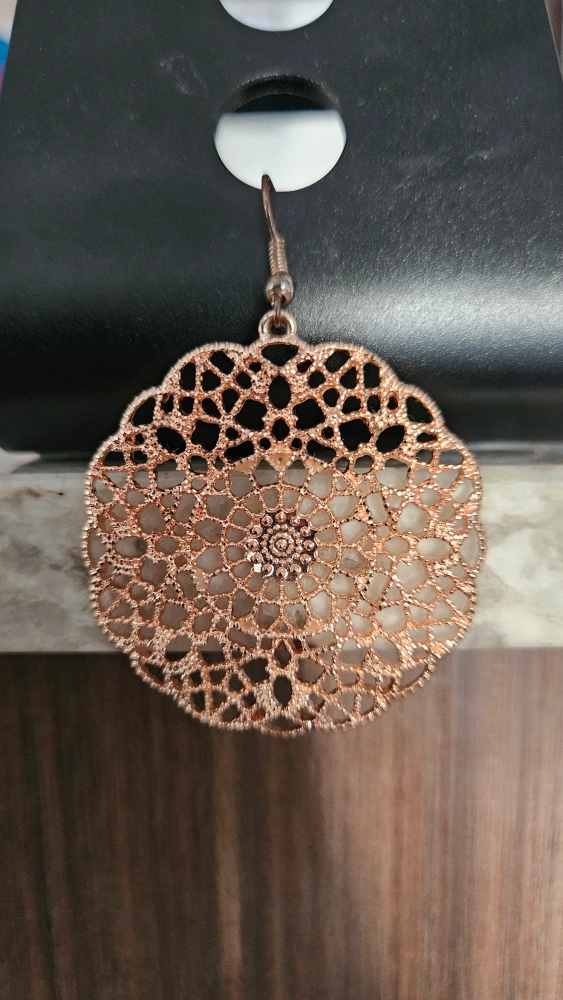 105Beautiful rose gold coloured round drop earrings. Intricate filigree design. Lightweight and dangles nicely.