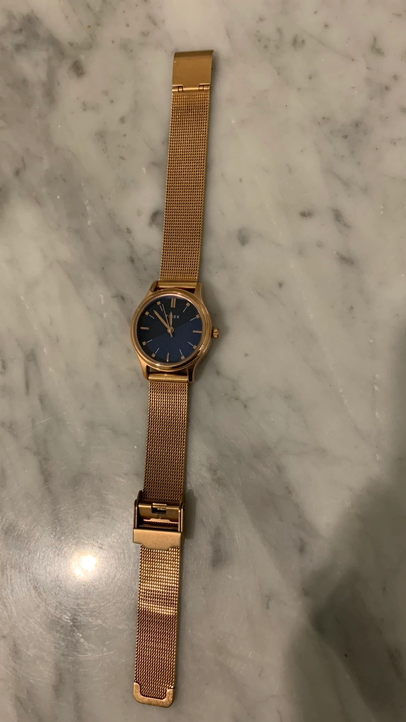 This is a rose gold watch with a blue face and a mesh band from Timex. My mom got it as a gift, but she is not into watch anymore.