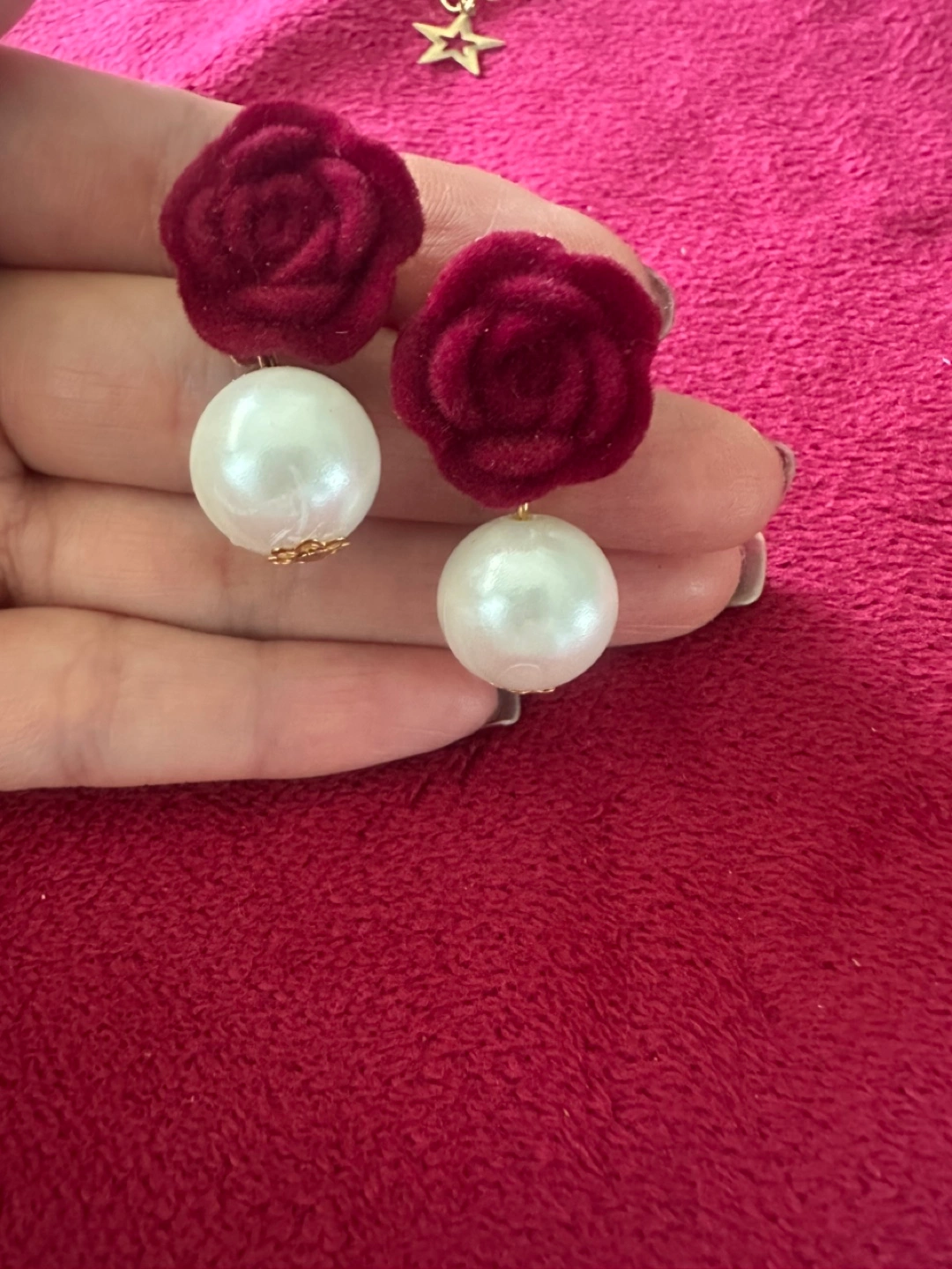 15Selling a pair of earrings with a unique design! They feature a burgundy rose on top and a white pearl at the bottom. Perfect for adding a touch of elegance to any outfit