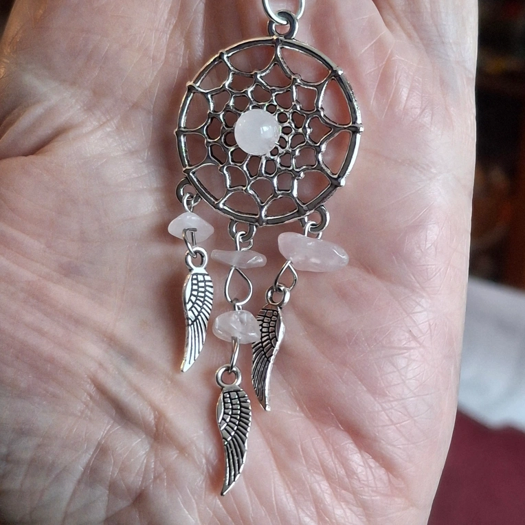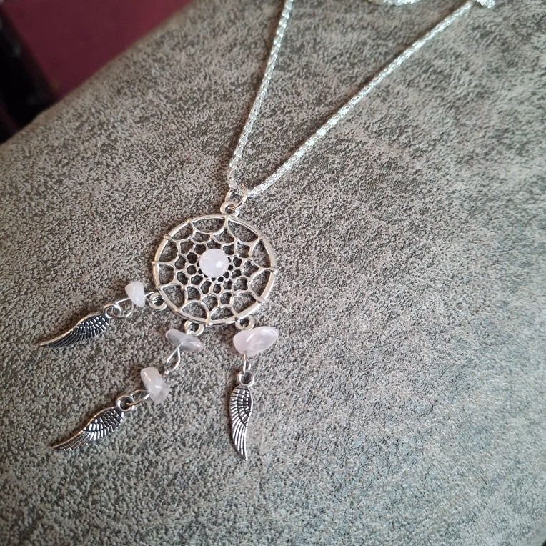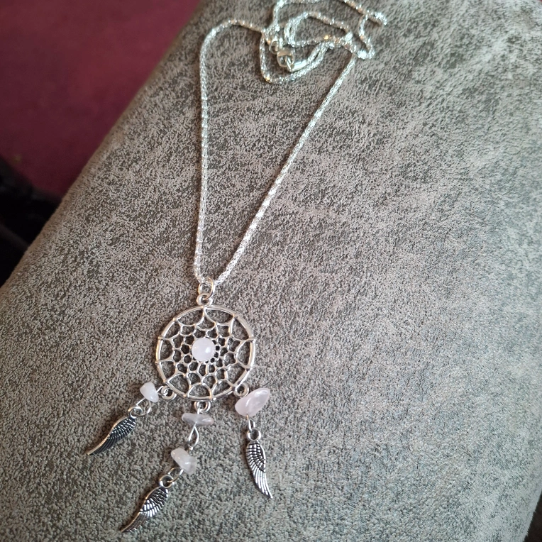 Selling a dream catcher necklace. It has a silver chain and a dream catcher pendant with small rose quartz stones and angel wing charms hanging from it. It would make a lovely gift!
