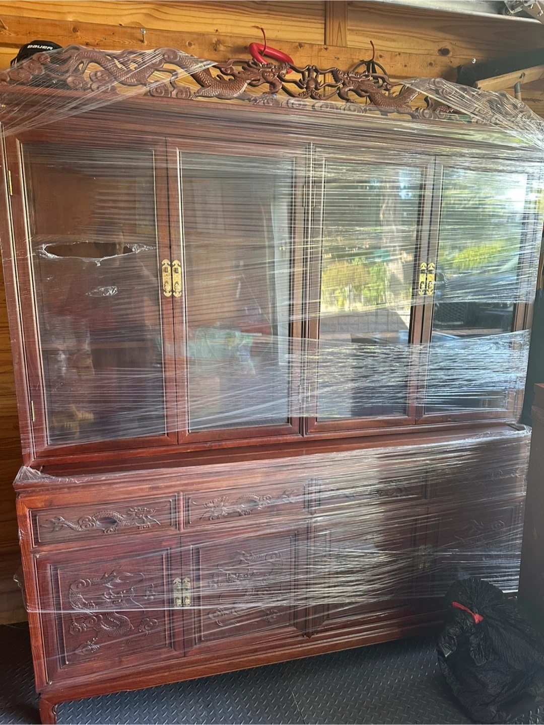 10Selling a beautiful wooden china cabinet featuring intricate dragon carvings. It's a unique piece that would add a touch of elegance to any dining room or living space. The cabinet is currently wrapped for protection during transport. Message me if you're interested!