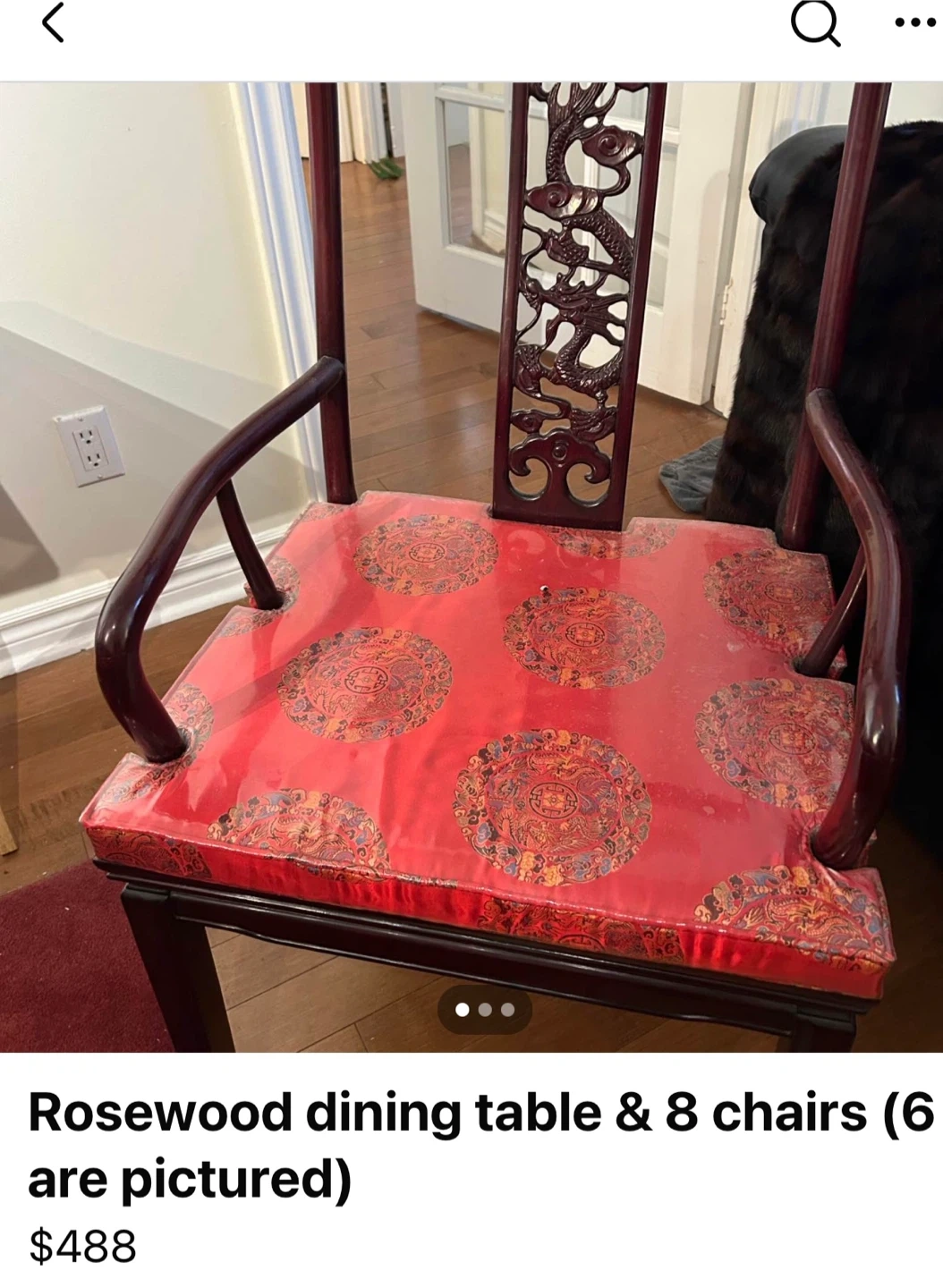 5Selling a rosewood dining table with 8 chairs (6 are pictured). The set features intricate detailing and a classic design, perfect for adding a touch of elegance to your dining room. Glass protector on top. For pick-up only. Bring your own van, dollies and movers.