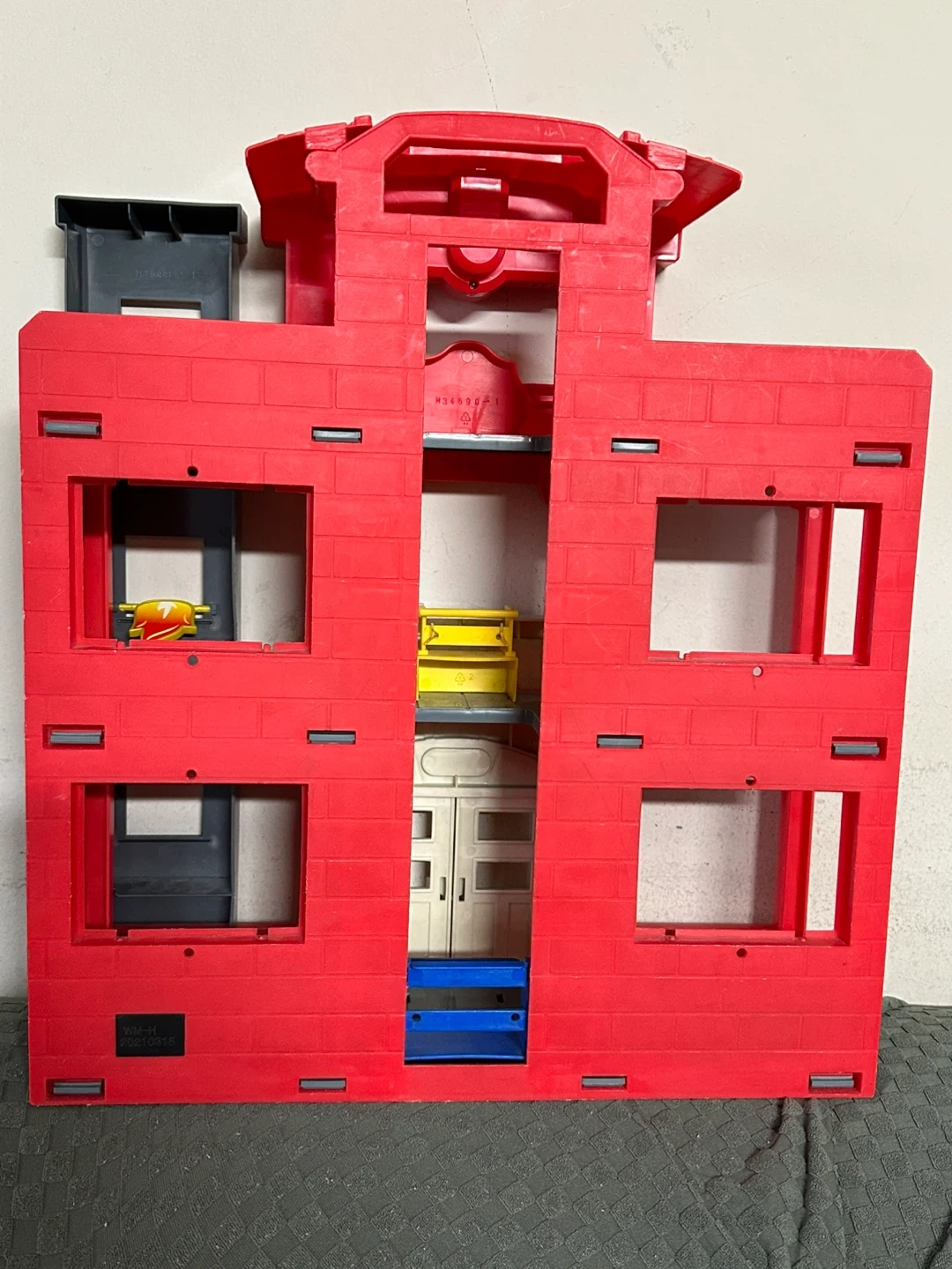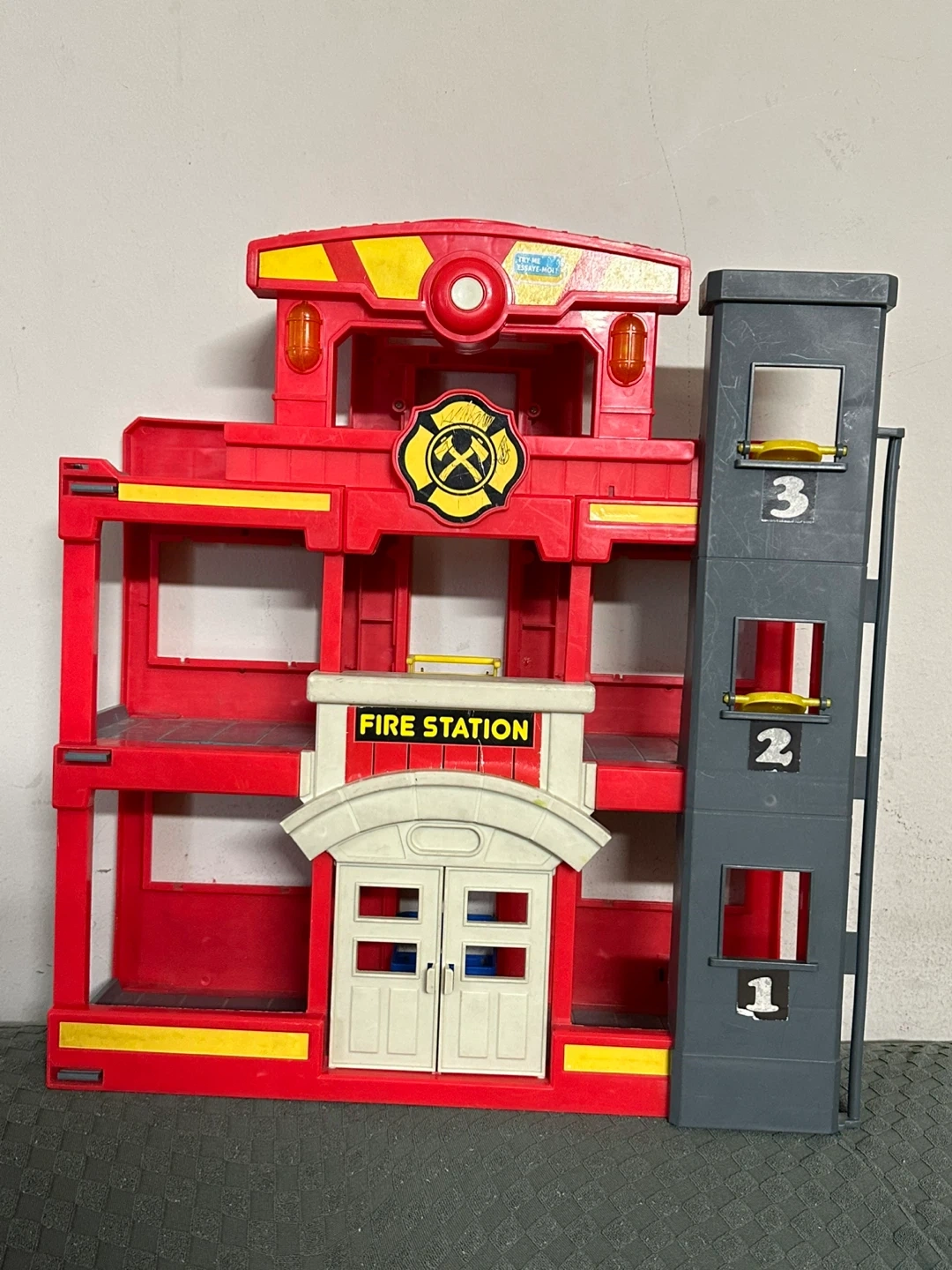 This is a Little People Fire Station playset. It's red and grey with yellow accents. Features include a garage and numbered levels for imaginative play.