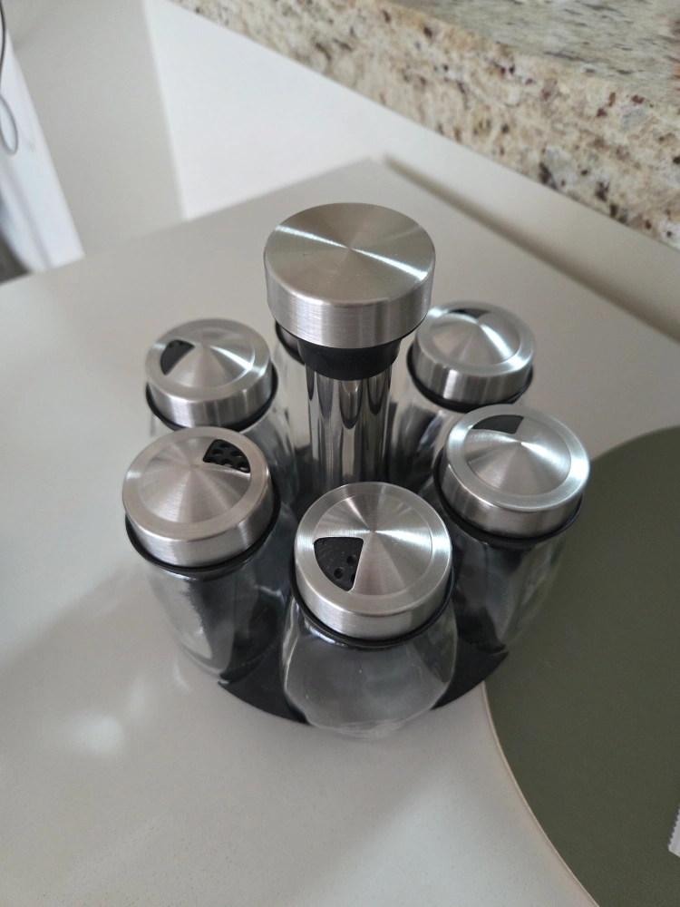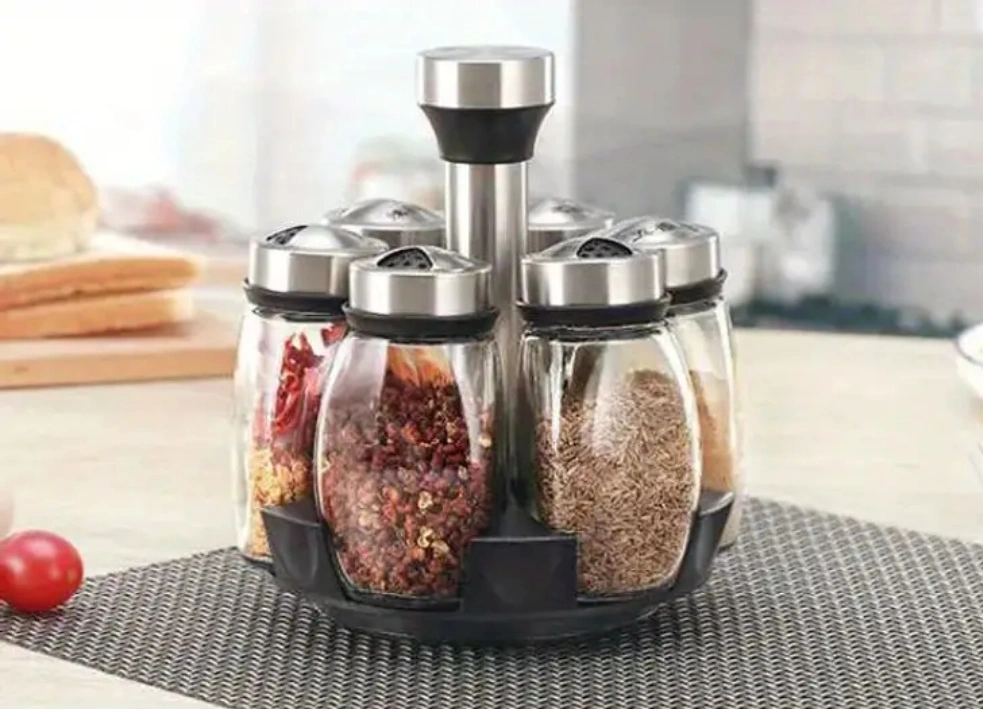 351Six-jar rotating spice rack. Stainless steel lids and central rotating column. Glass jars. Organize your spices easily.
