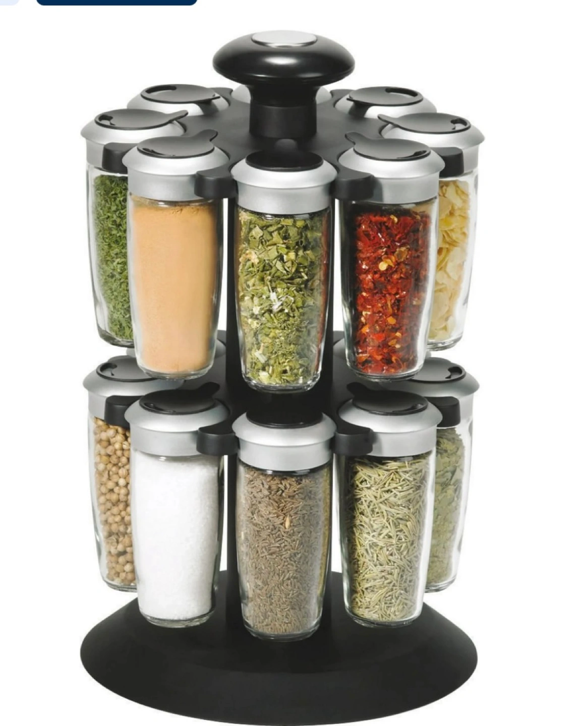 Keep your spices organized and within easy reach with this rotating spice rack! It comes with 12 jars, perfect for storing all your favourite herbs and spices. A great addition to any kitchen!