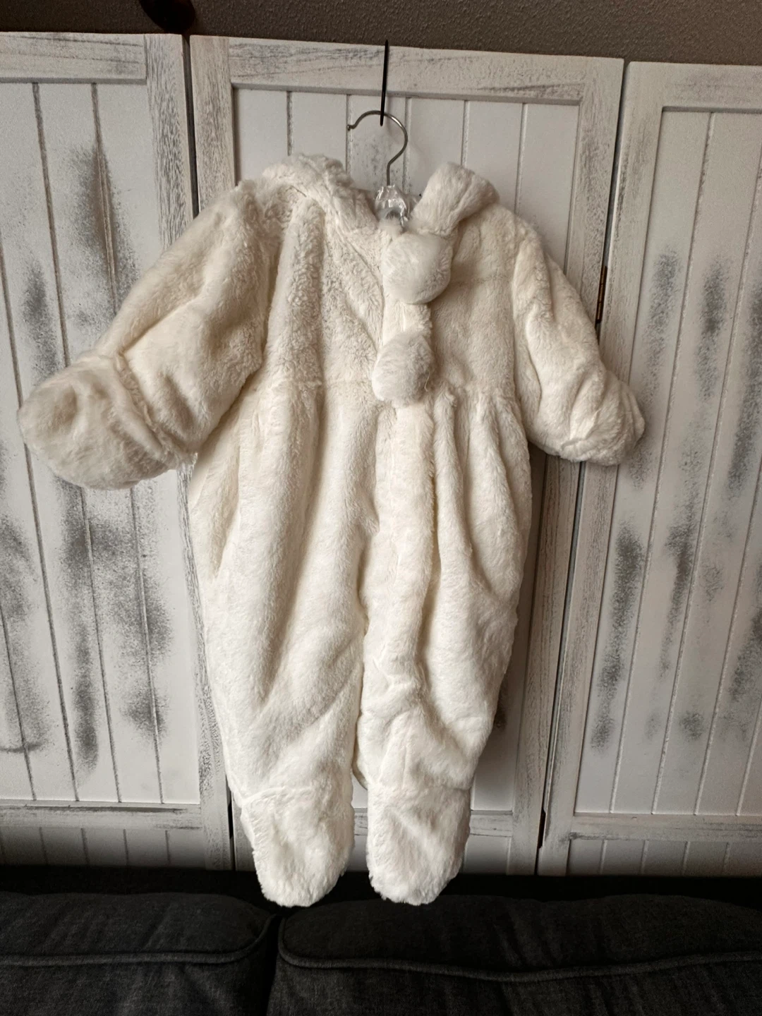 70A super cozy baby snowsuit from Rothschild! It's a faux fur creamy white colour and is in great condition . Perfect for keeping your little one warm this winter season.