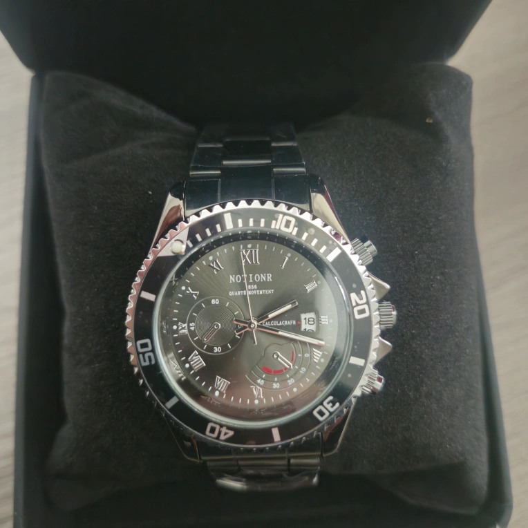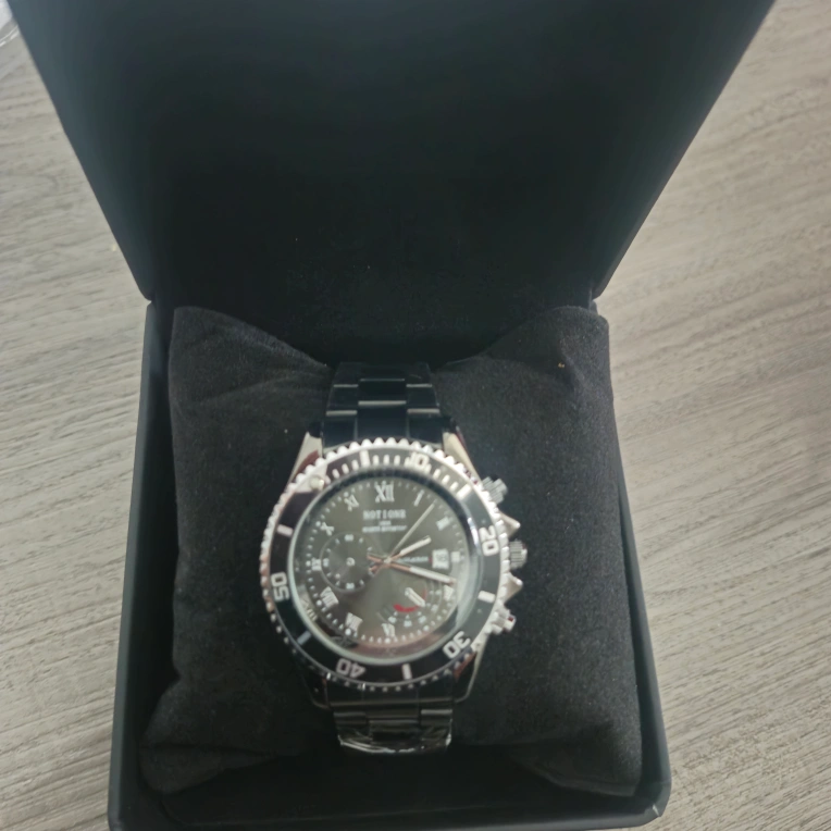 Men's wristwatch. Black band. Silver face. Chronograph functions. Comes in original box.