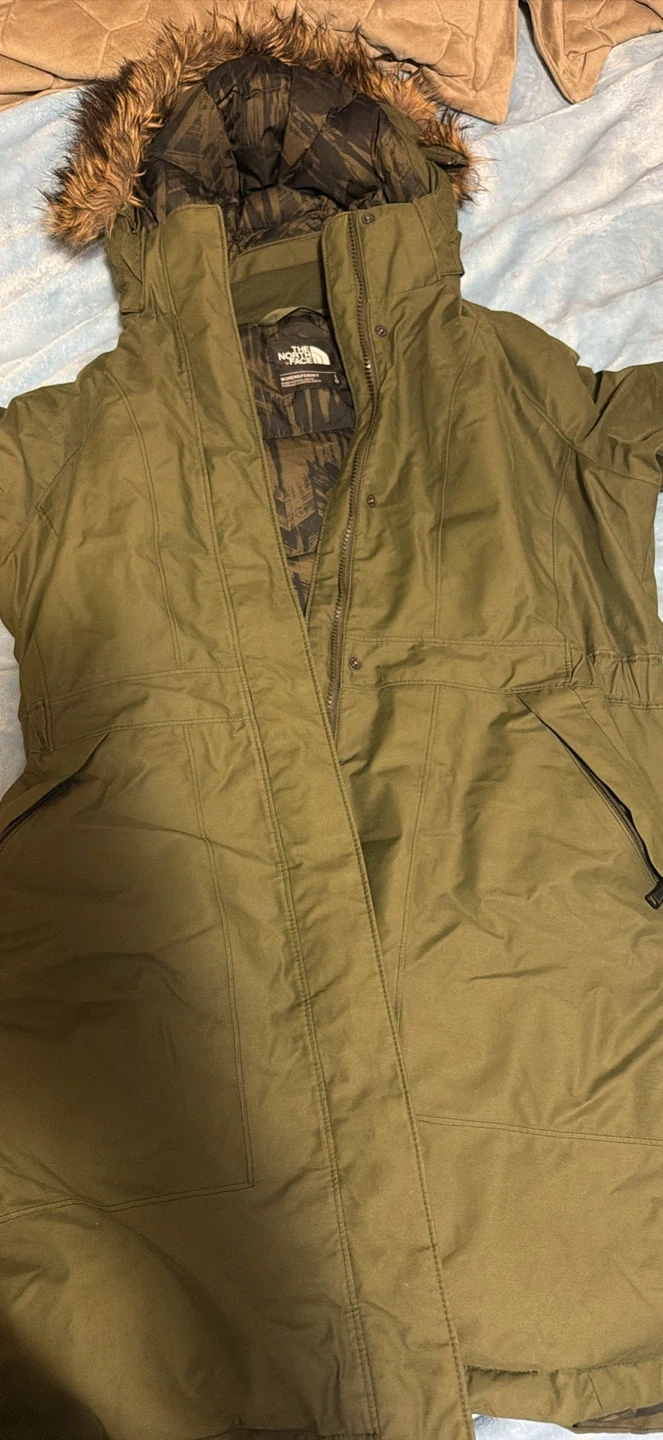 A warm, insulated parka jacket from The North Face. It features a faux-fur trimmed hood and a camouflage lining. Size is small.