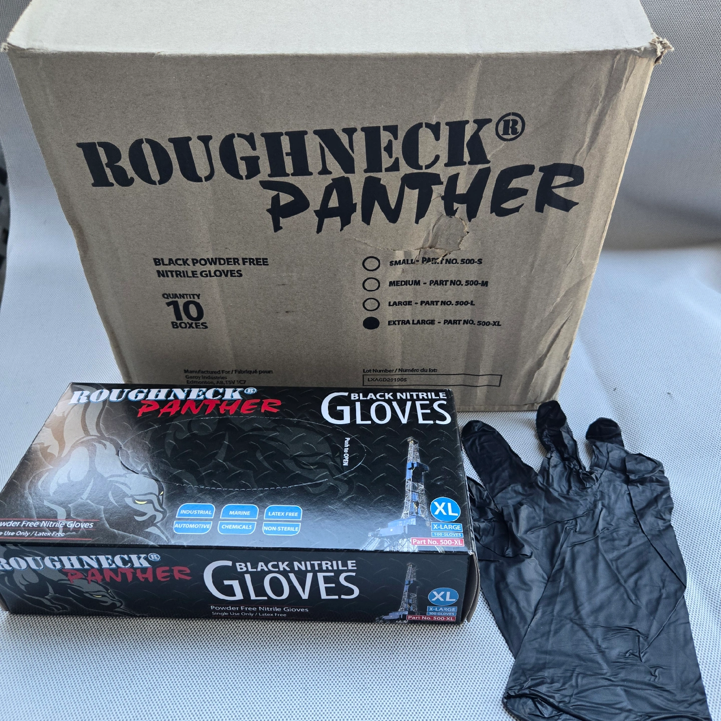 10Selling cases of Roughneck Panther black nitrile gloves. They are size extra large (XL) and come with 10 boxes. Perfect for automotive, industrial, marine, and chemical use. They are powder and latex free