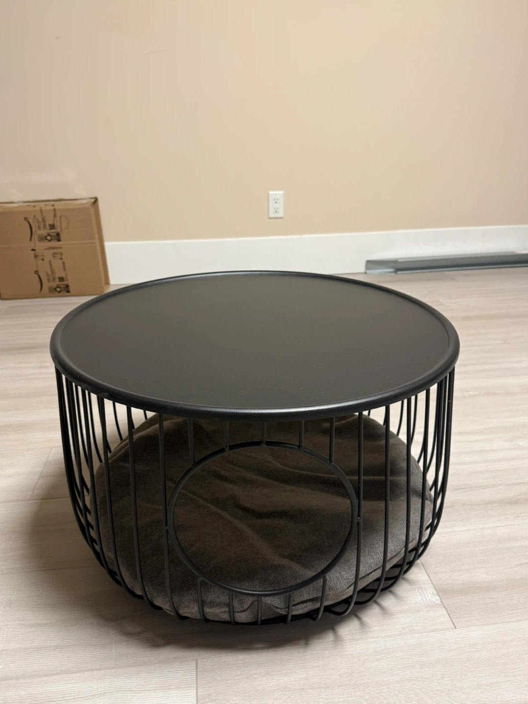 10Here's a BRAND NEW stylish modern round coffee table! It features a black metal frame and a comfy grey cushion. The top can also be used as a small table or surface. It's brand new and would look lovely in any home. Easy to clean and perfect for cat or dog owners!