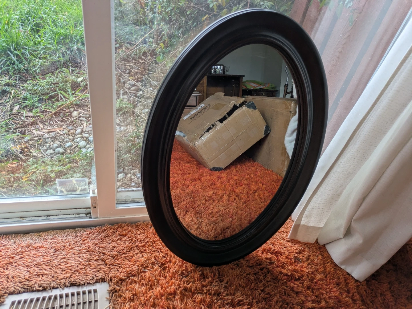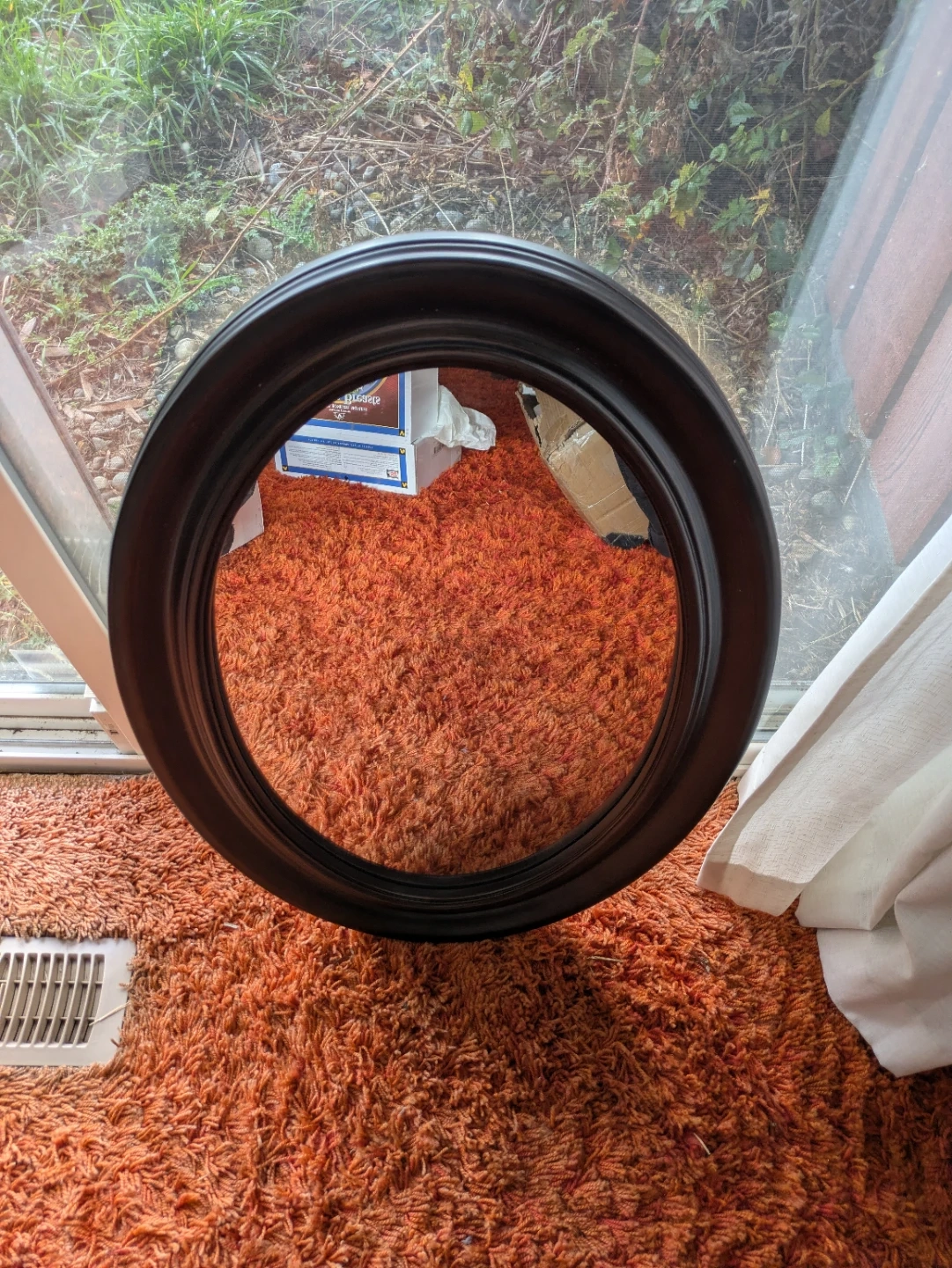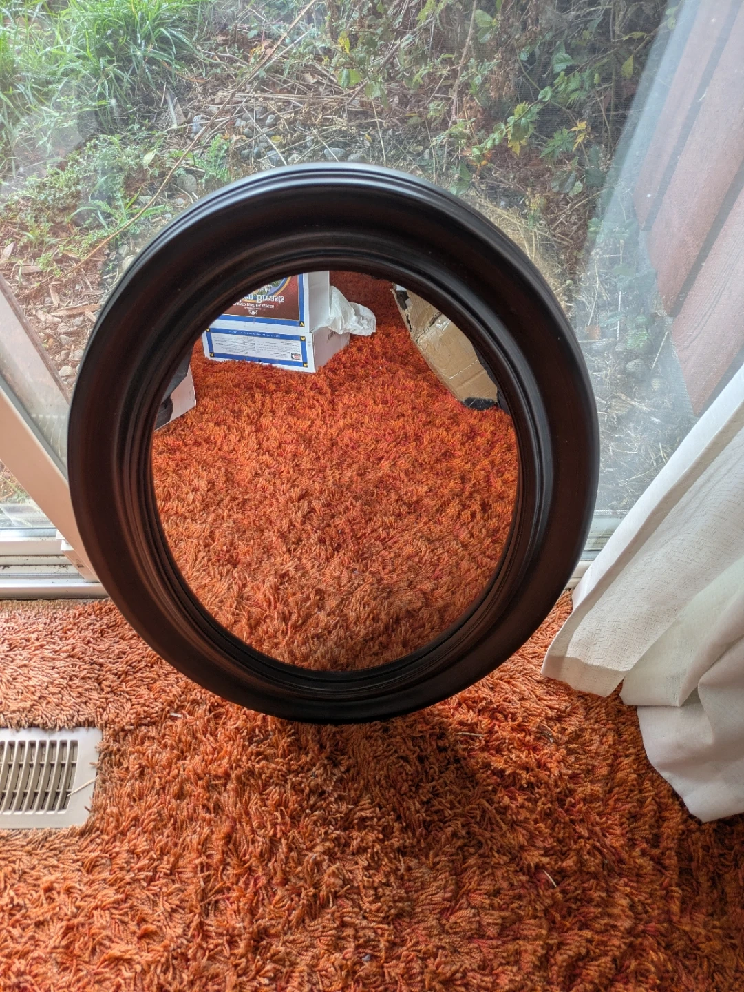 10Selling a round mirror with a black frame. It's in great condition and ready to add a touch of style to your home. The mirror has a simple, elegant design that will complement any decor