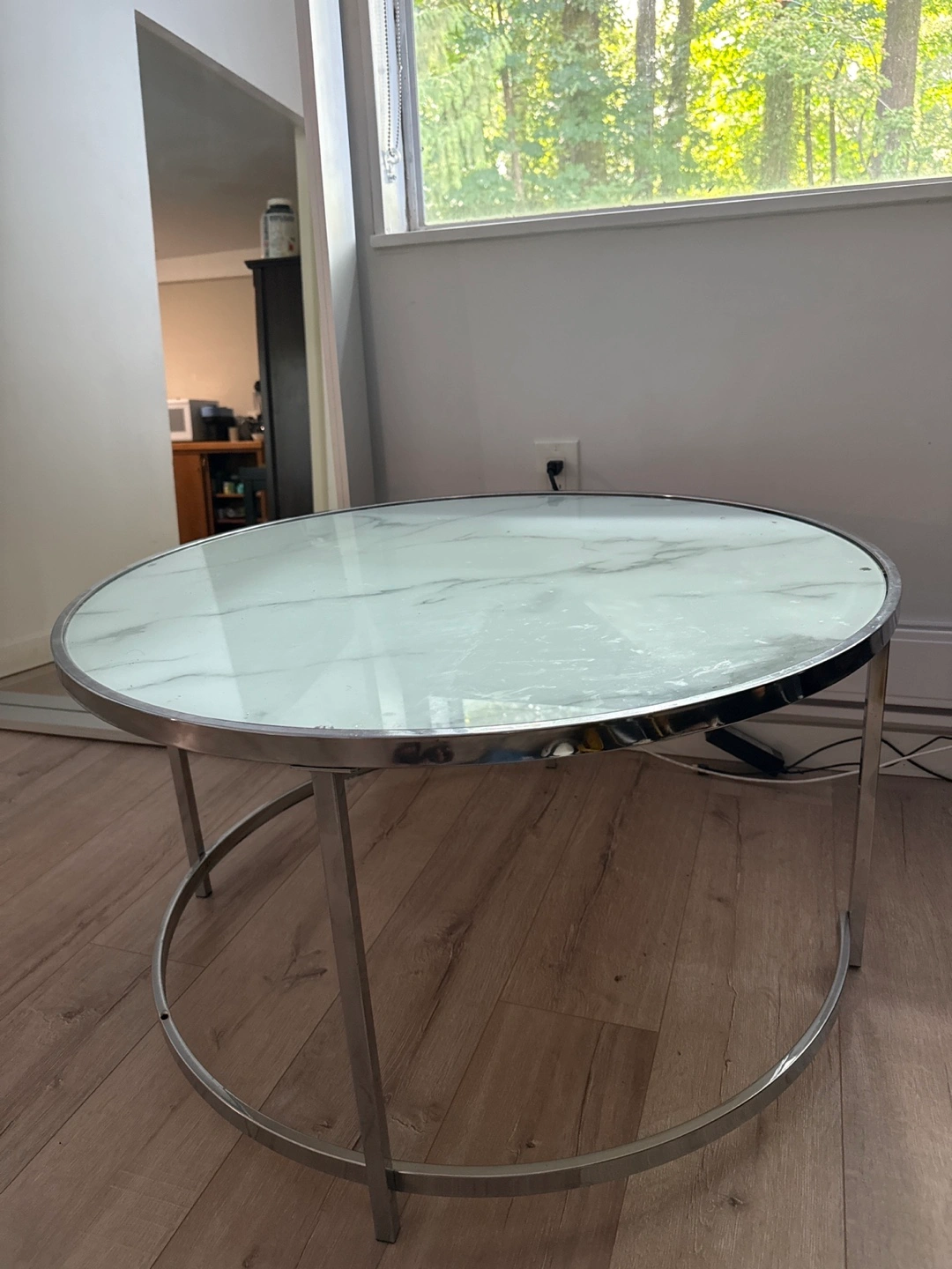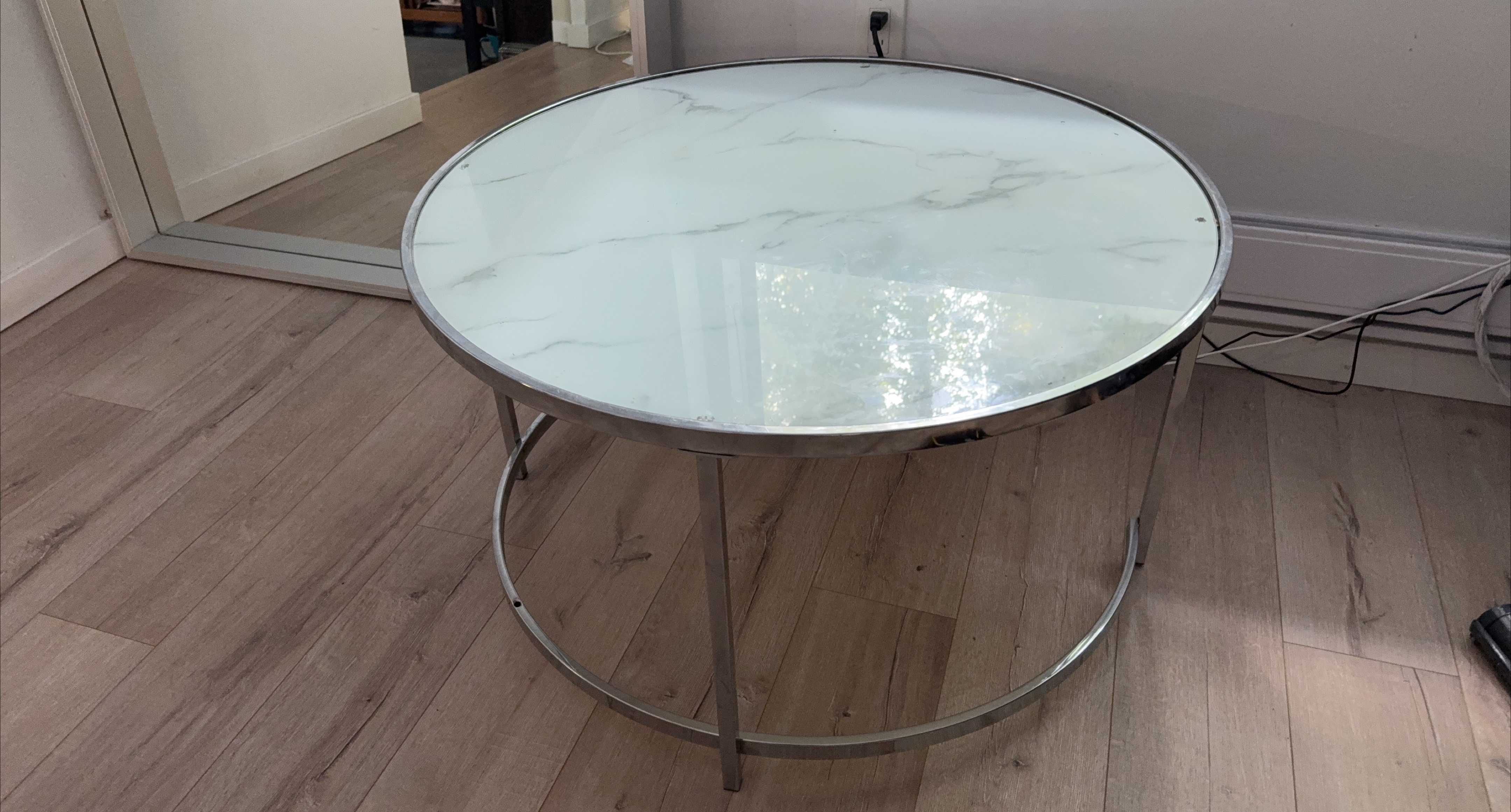 Selling a stylish round coffee table with a faux glass top and a sleek silver frame. It's in great condition and would look lovely in any living room. The table has a modern design that would complement various decor styles. It's sturdy and ready for a new home!