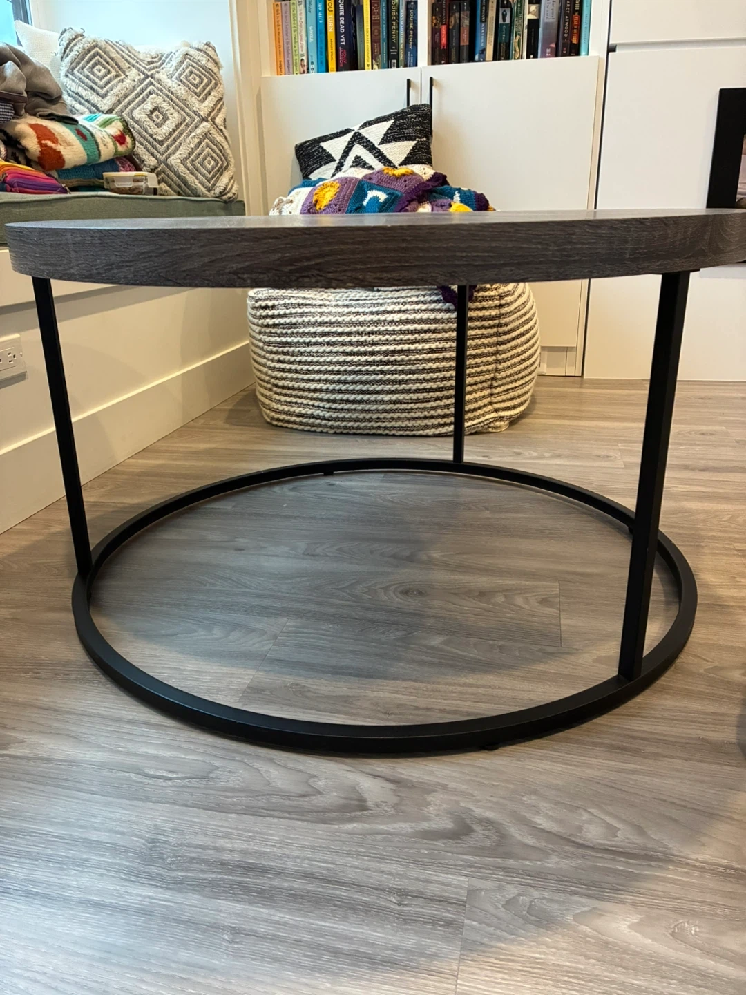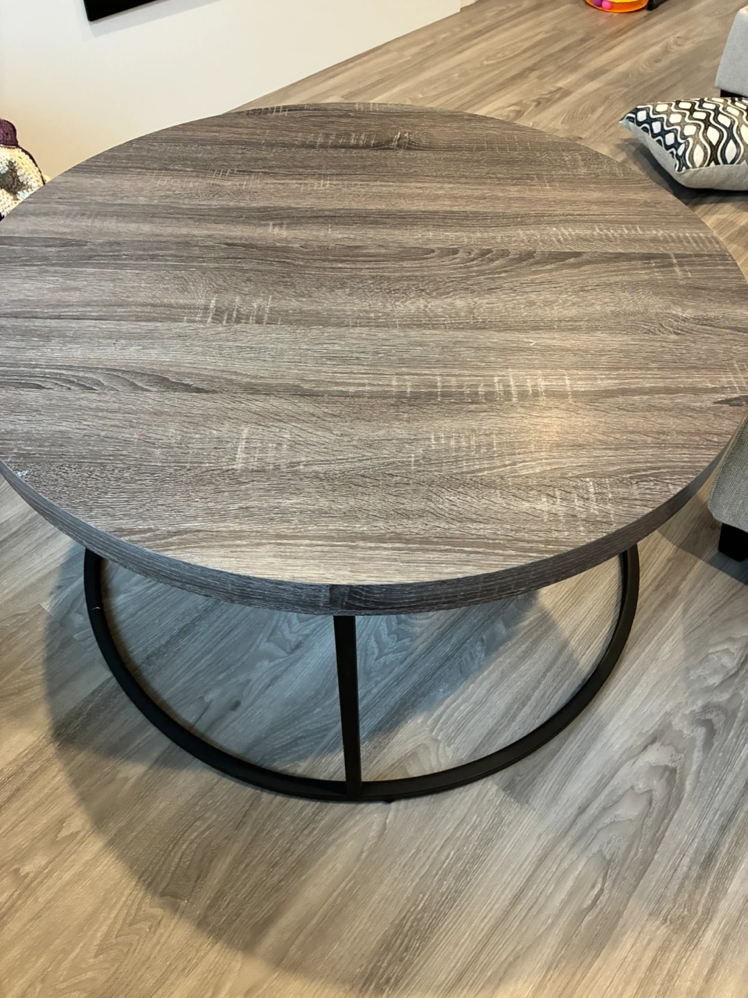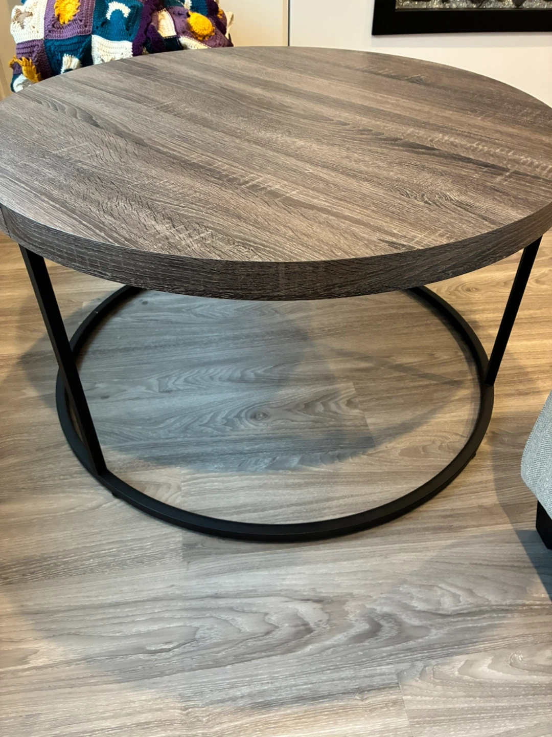 145Selling a round coffee table with a lovely wood grain finish! It's in great shape and would look perfect in any living room. The black metal base adds a modern touch, and it's super sturdy.