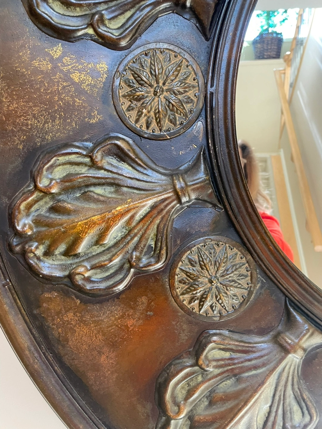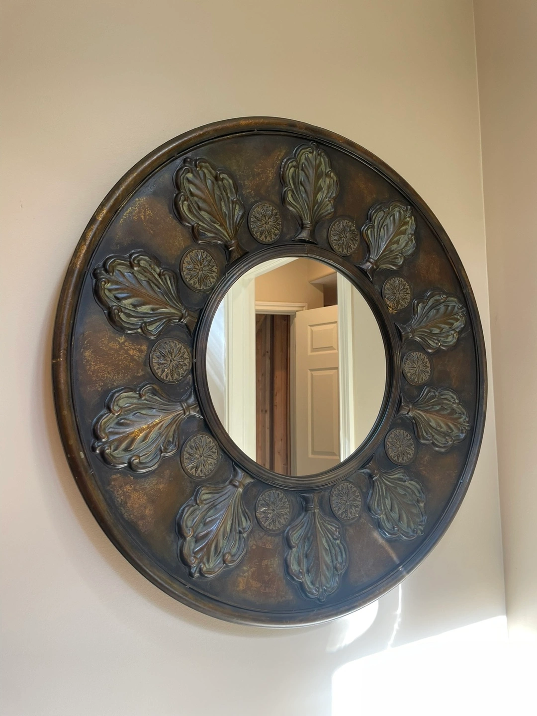 Selling a decorative round wall mirror. It has a unique design with leaf and starburst accents around the frame. It's perfect for adding a touch of elegance to any room! No visible brand or model name.