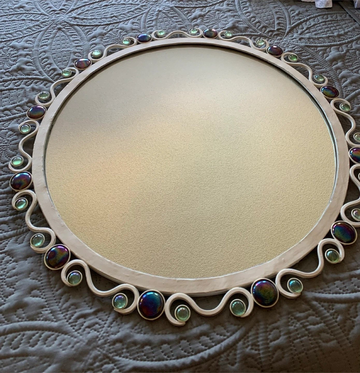 68Selling a charming round wall mirror! It features decorative iridescent and green glass accents around the frame. The frame itself is a neutral off-white colour in wrought iron. Purchased from Bombay Kids