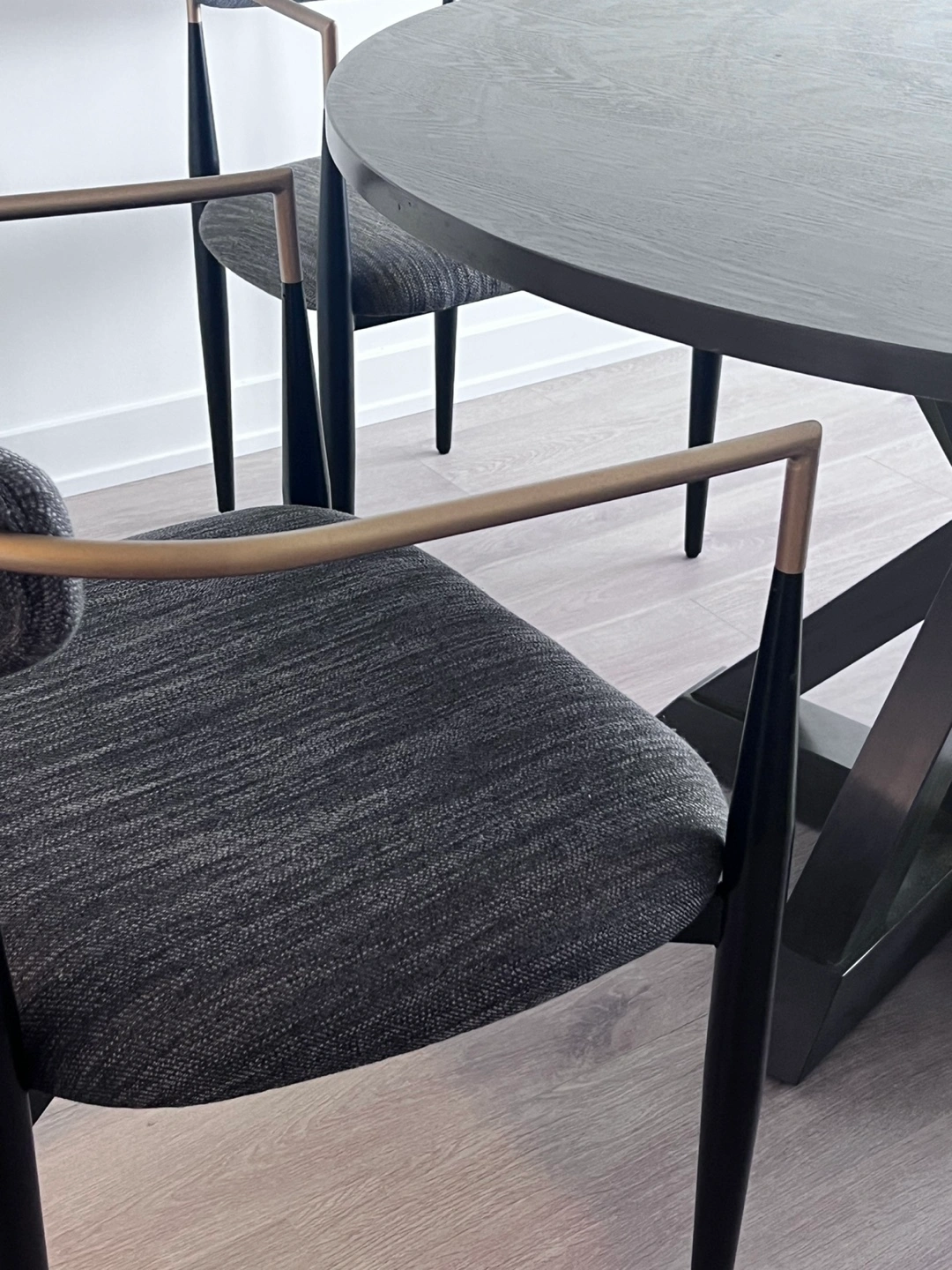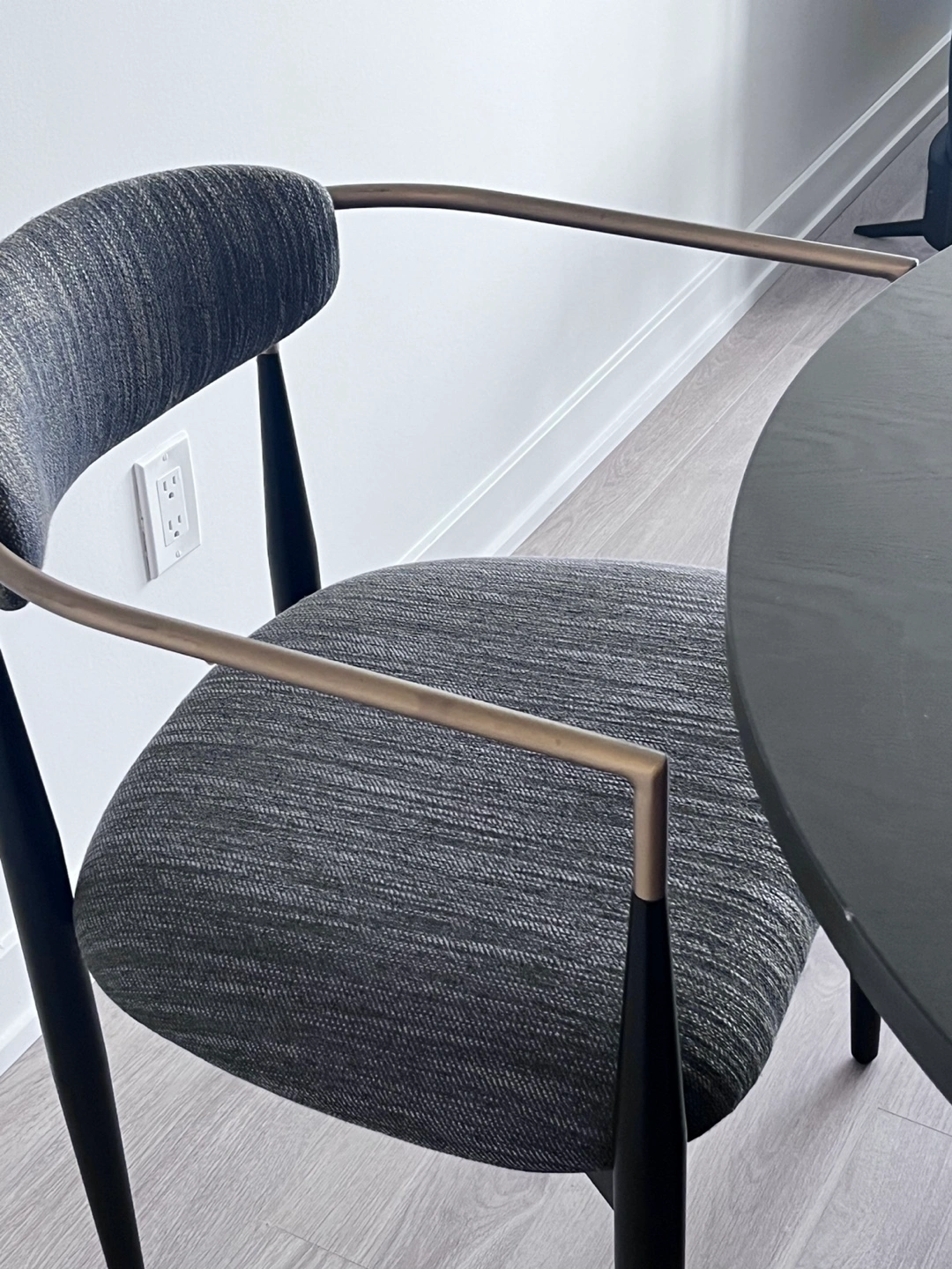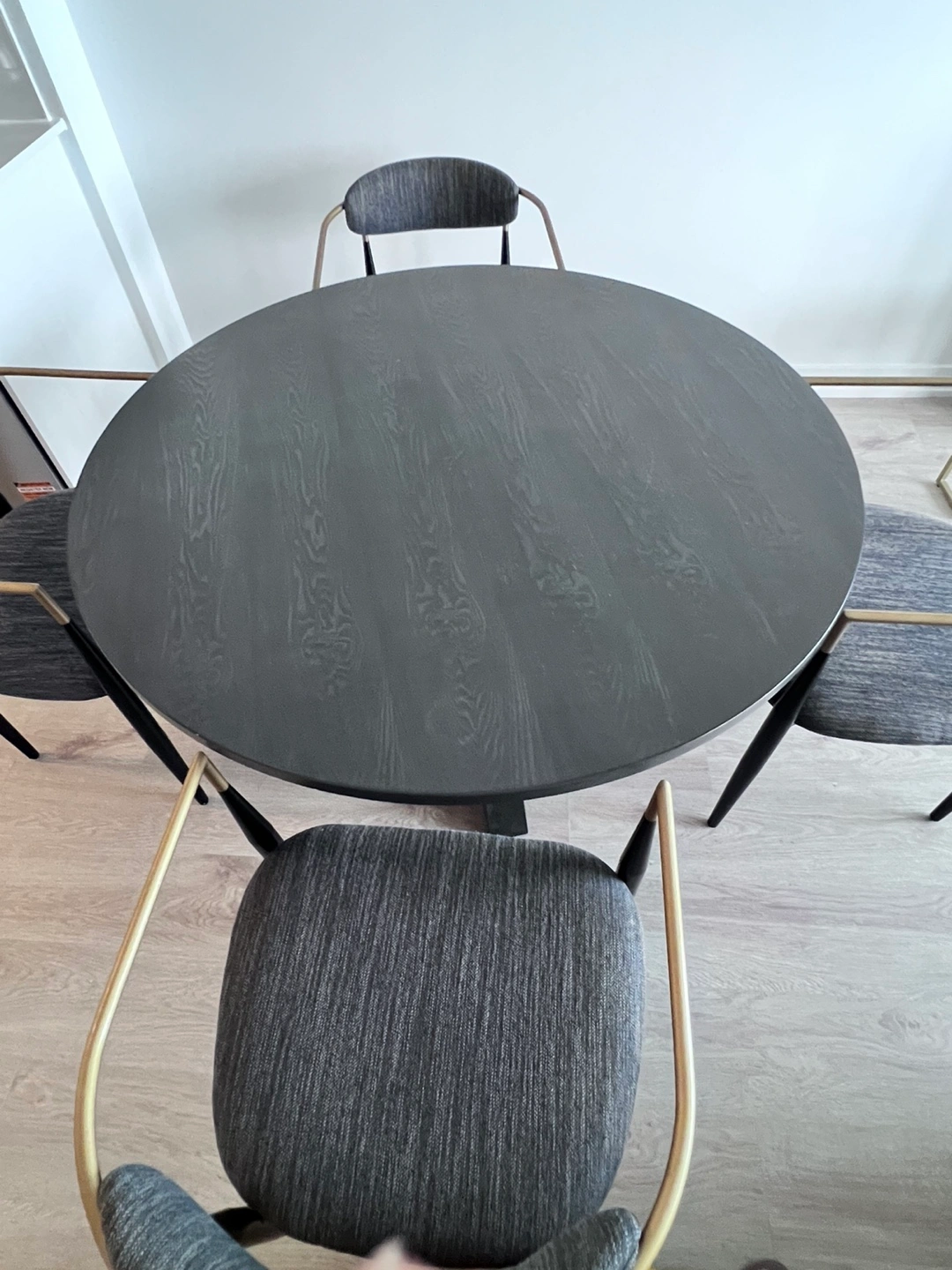 Selling a round dining table in a dark grey colour. It has a wood grain texture and comfortably seats four people. There are some minor signs of use, but overall it's in good condition for its age! It comes with 4 chairs with brass yellow arms, black legs and grey fabric. I can deliver if distance is reasonable.