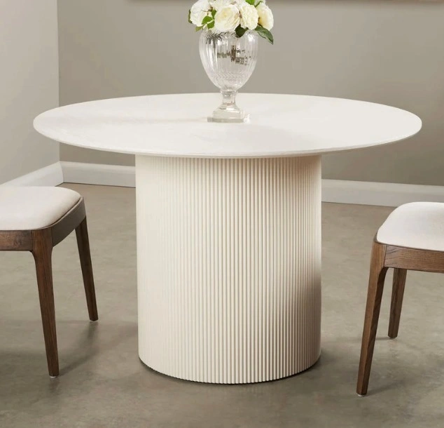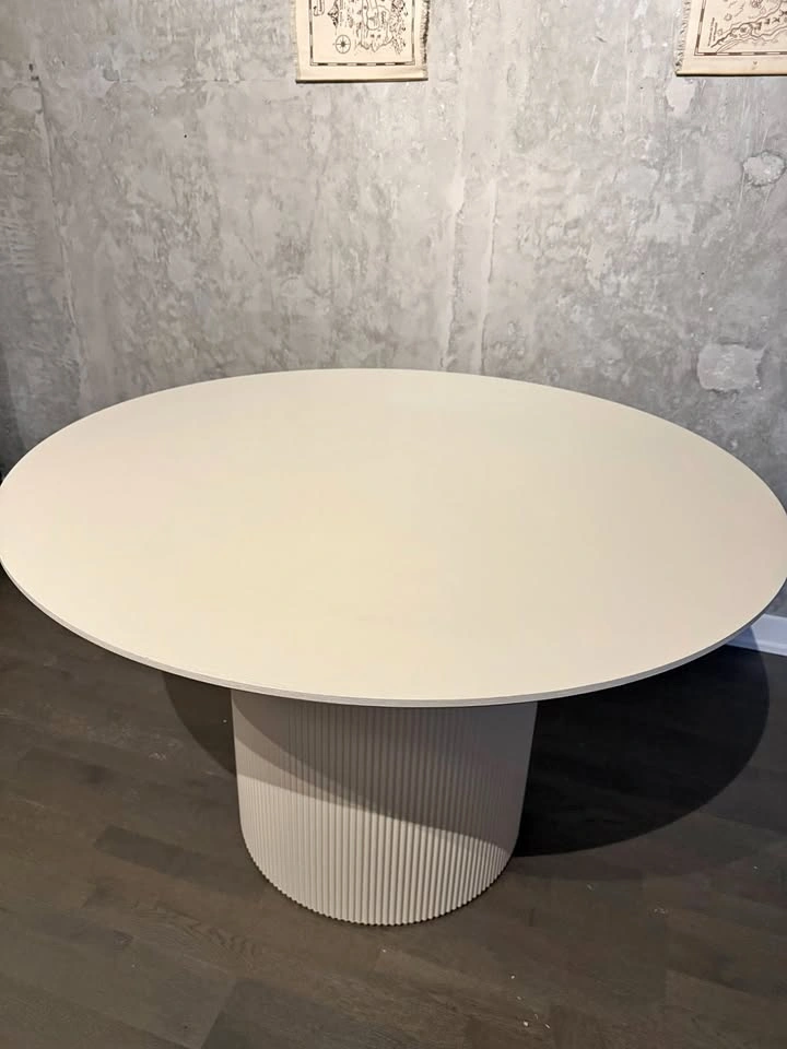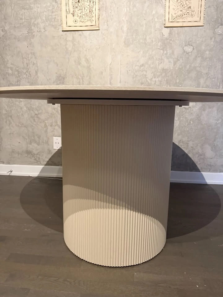 Color: Ivory Wood top dining table with ivory/black oak veneer Beautiful flute design wood base Dimensions: 47.25"Dia. x 30"H Link: https://crafthomedecor.com/products/melody-dining-table?variant=45716777009397 Table can be taken apart and fit in car…or walk its not super heavy.