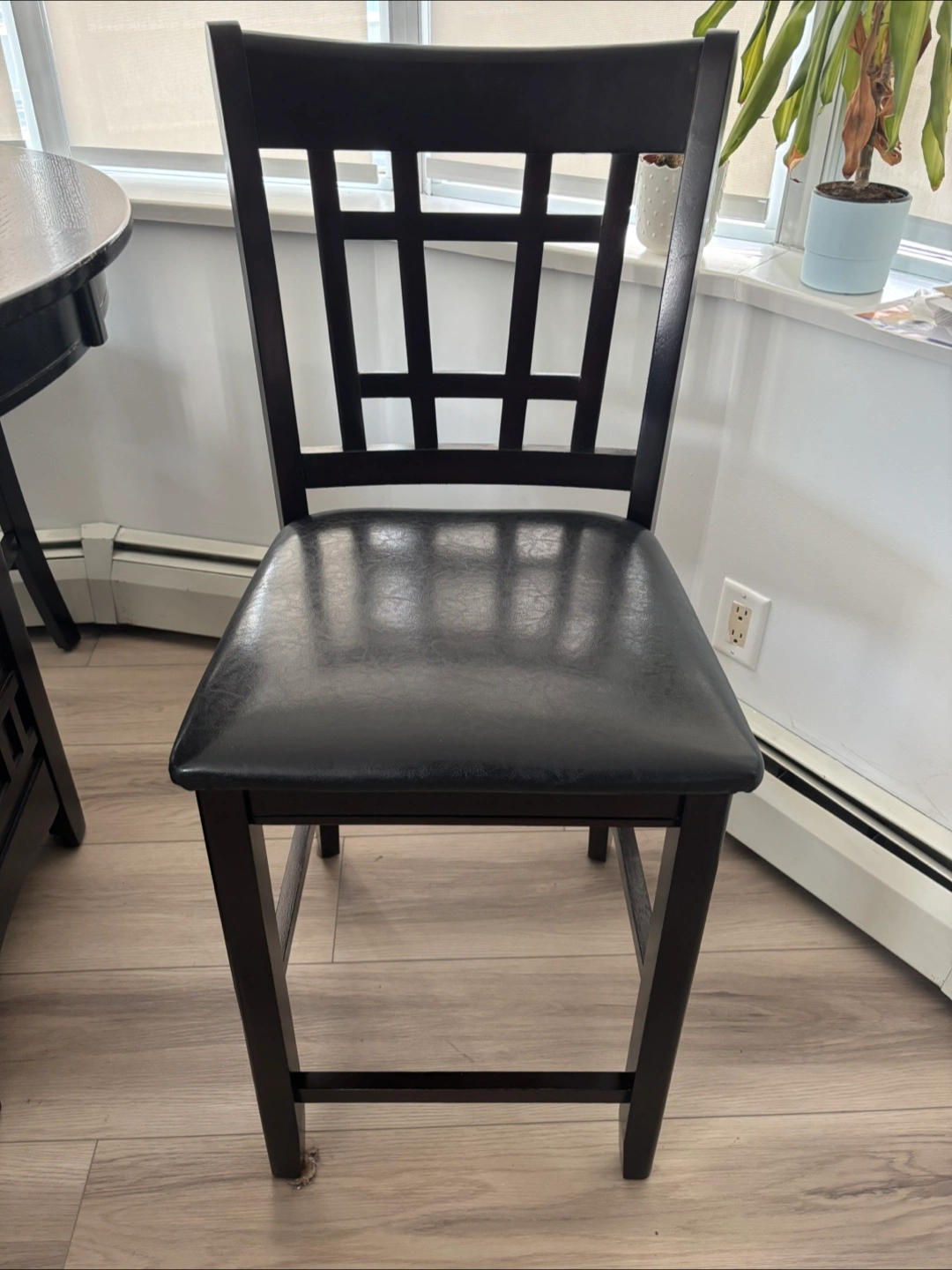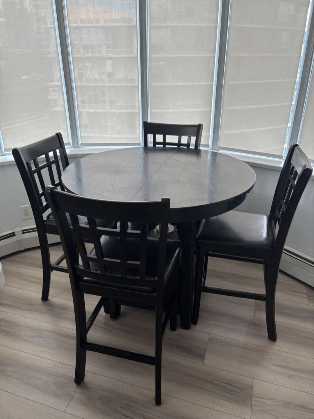 Selling a round dining table with four matching chairs. The set is made of dark wood and features a classic design that would fit well in any dining space. The chairs have comfortable, padded seats. It's a great set for a small family or apartment!