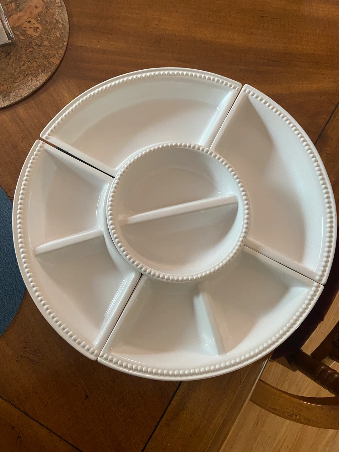 10entertaining platter in great condition. It's perfect for serving appetizers or snacks at your next gathering! The platter includes a central dip bowl and four detachable quarter-circle trays, all in a clean, white finish. Lazy Susan No chips