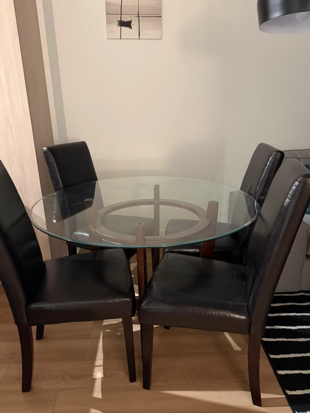 15Round Glass Dining Table with 4 Leather Chairs – Good Condition Selling a round glass dining Round Glass Dining Table with 4 Leather Chairs – good Condition. We recently moved to a smaller apartment, and it’s just a bit too big for our new space. Dimensions: 45 inches (diameter) × 30 inches (height) Perfect for apartments, condos, or family homes. Price: $250 Location: Near H2N 0E5 Message for details or to arrange pickup!