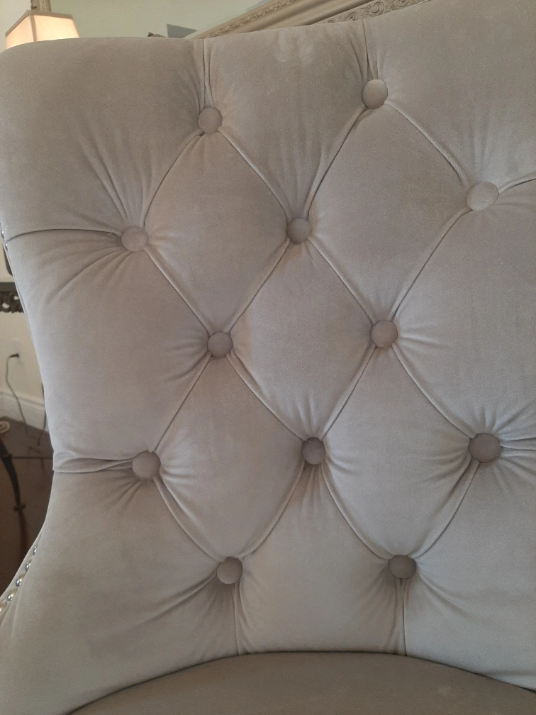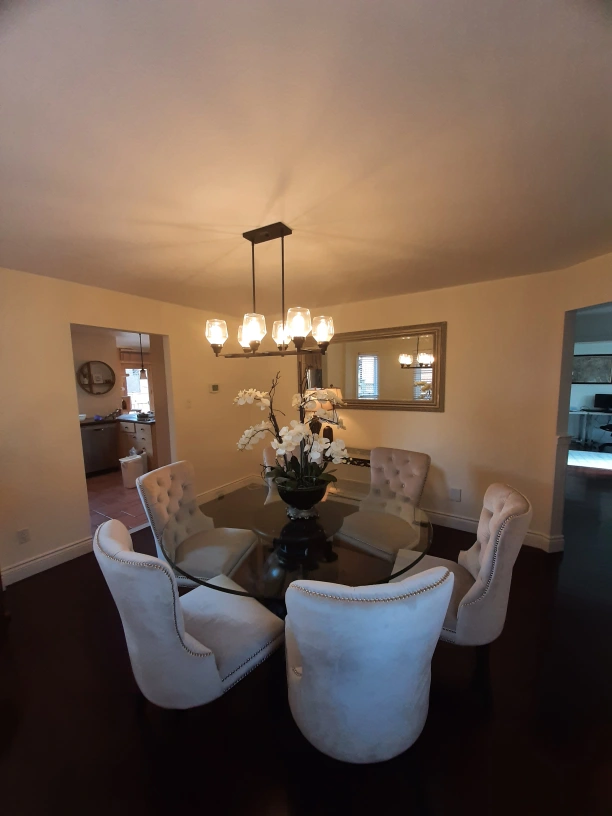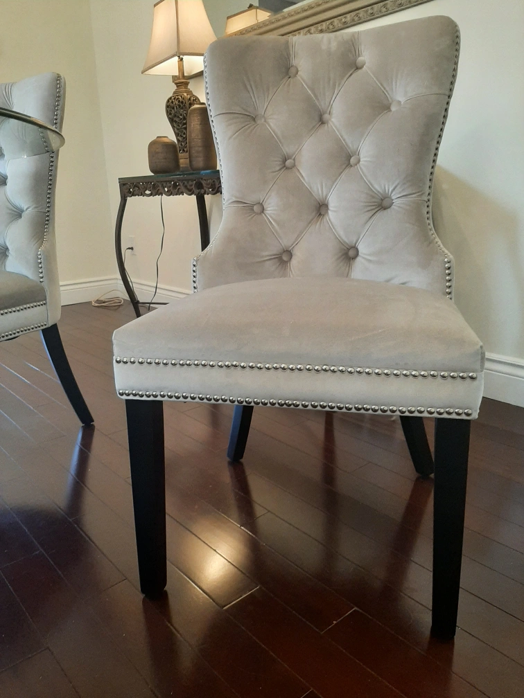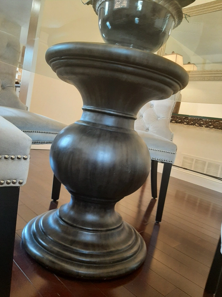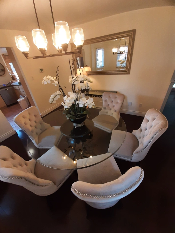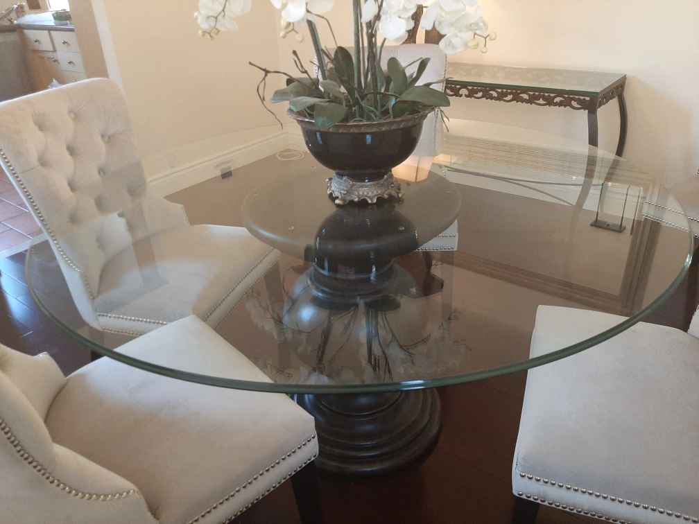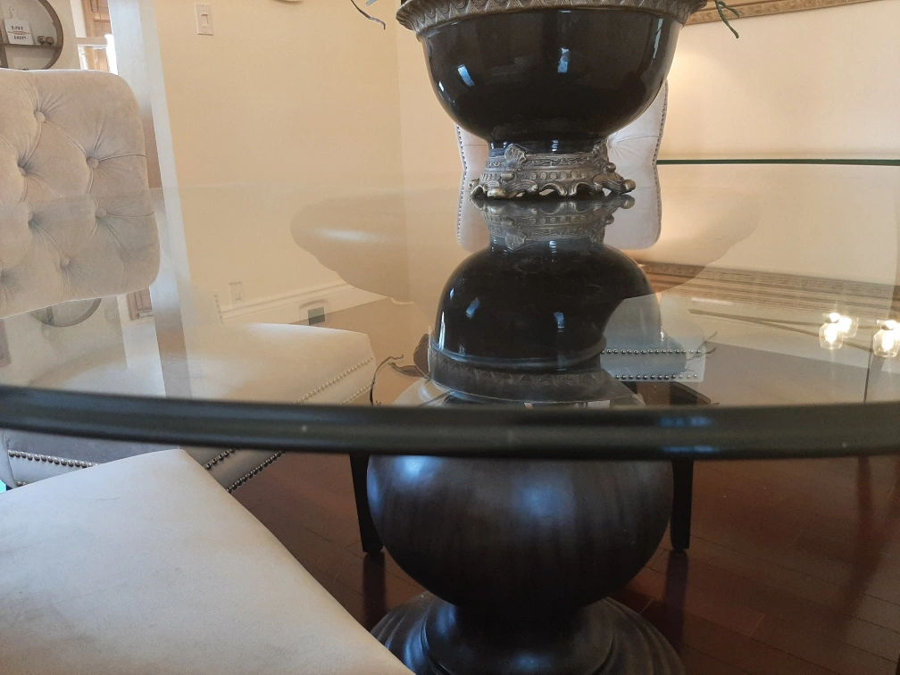 Elegant round glass dining table. Dark brown pedestal base. Six cushioned chairs included. Button tufting detail. Neutral beige upholstery.table 750, chairs are 450, but big discount if you get all.