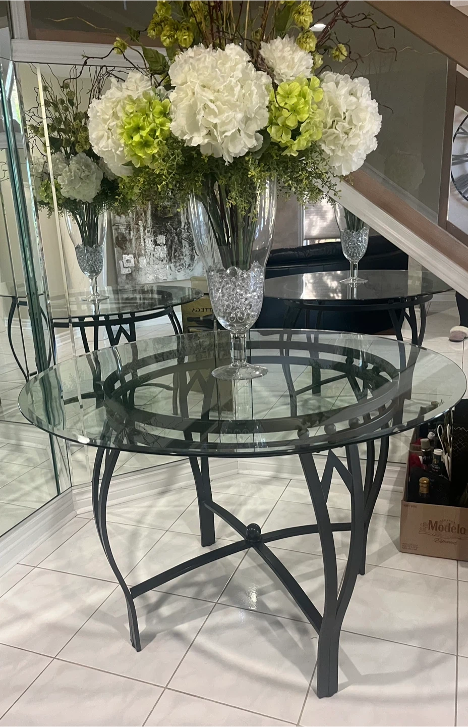 5Selling a round bevelled edge glass top table with a dark metal base. It's in great condition and would be a stylish addition to any dining room or living space / foyer decor .