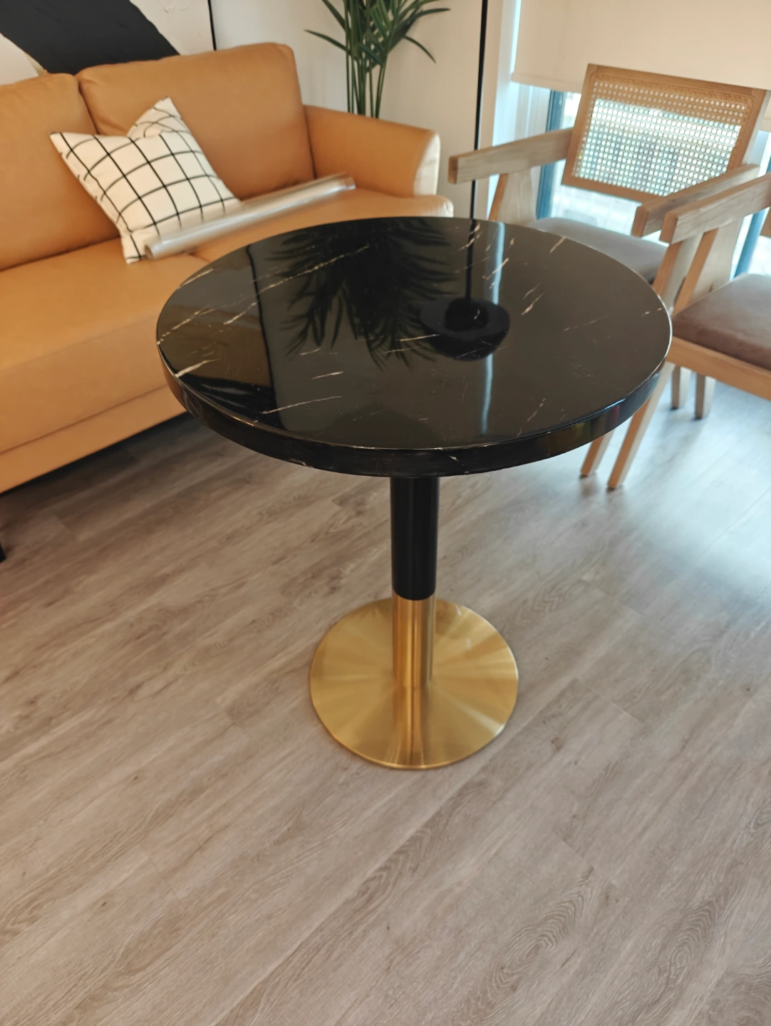 56Stylish round dining table. Features a black marble top and a gold-coloured base. Perfect for small spaces. Modern design. https://www.rona.ca/en/product/plata-import-ruby-black-round-dining-table-sct015-332041832
