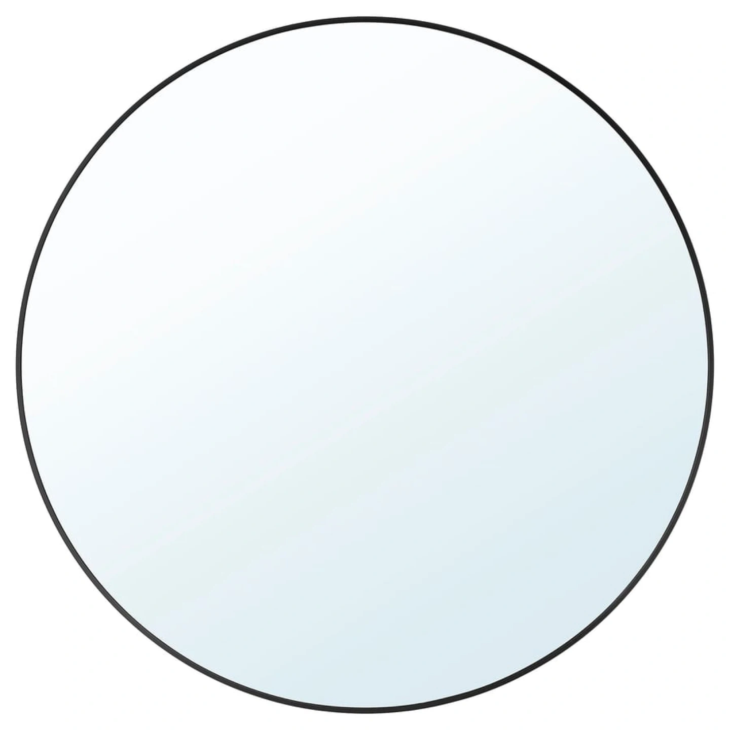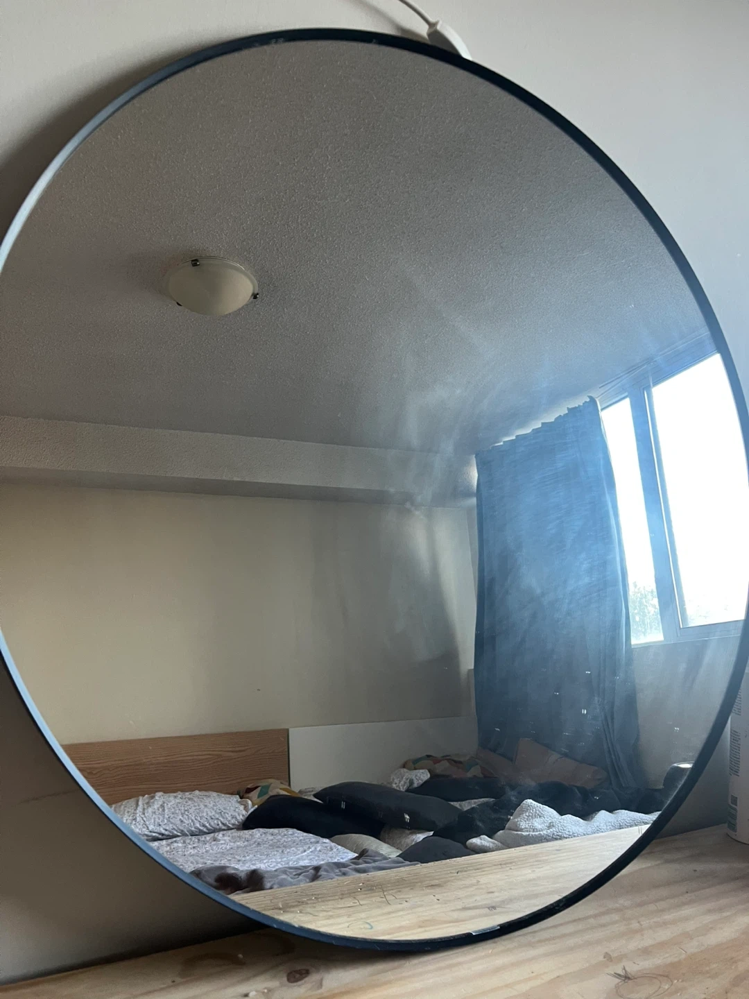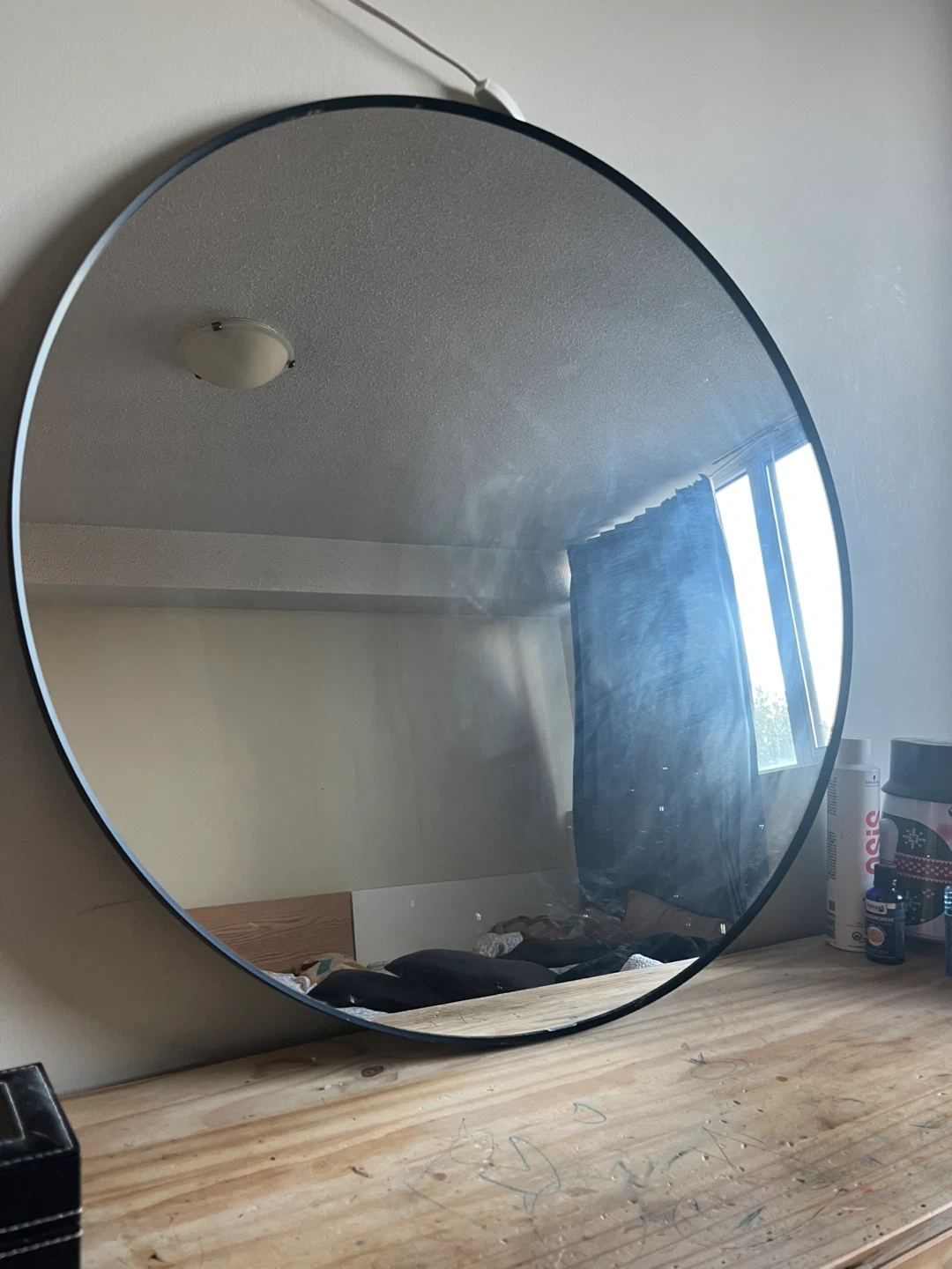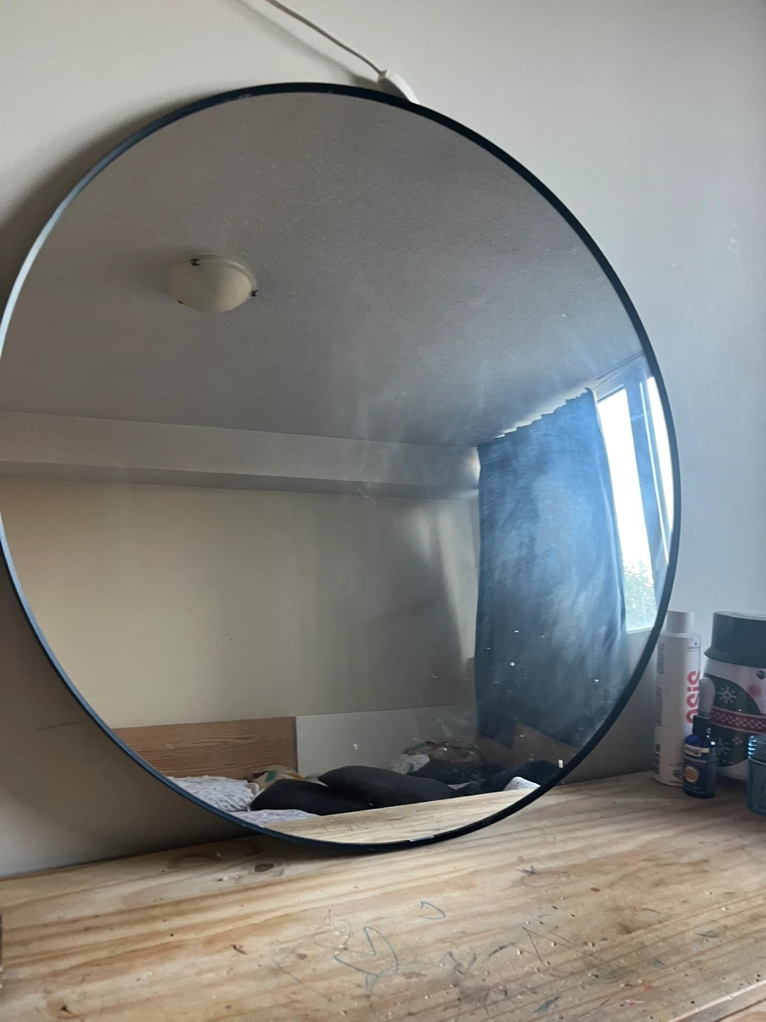 Selling a round mirror with a sleek black frame. It's in great condition and no scratches