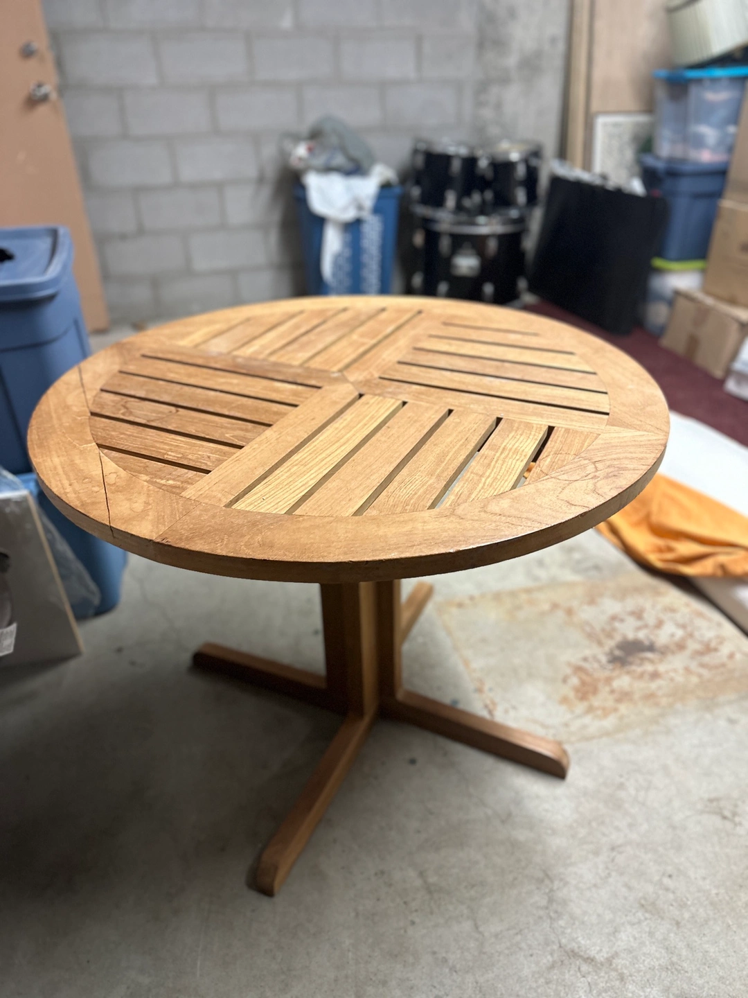 A round wooden table with a slatted top and a pedestal base. It is made from a natural wood with a natural finish. It would be a great addition to your outdoor patio space.