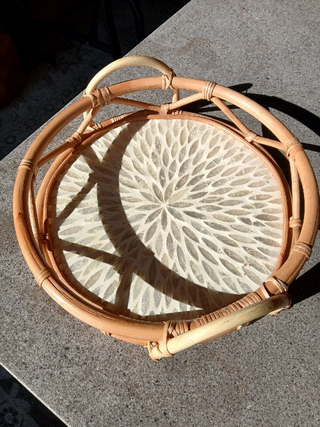 153Selling a lovely round serving tray made of rattan. It has a handle for easy carrying and would be perfect for serving snacks or drinks. It's in great condition and ready for a new home!